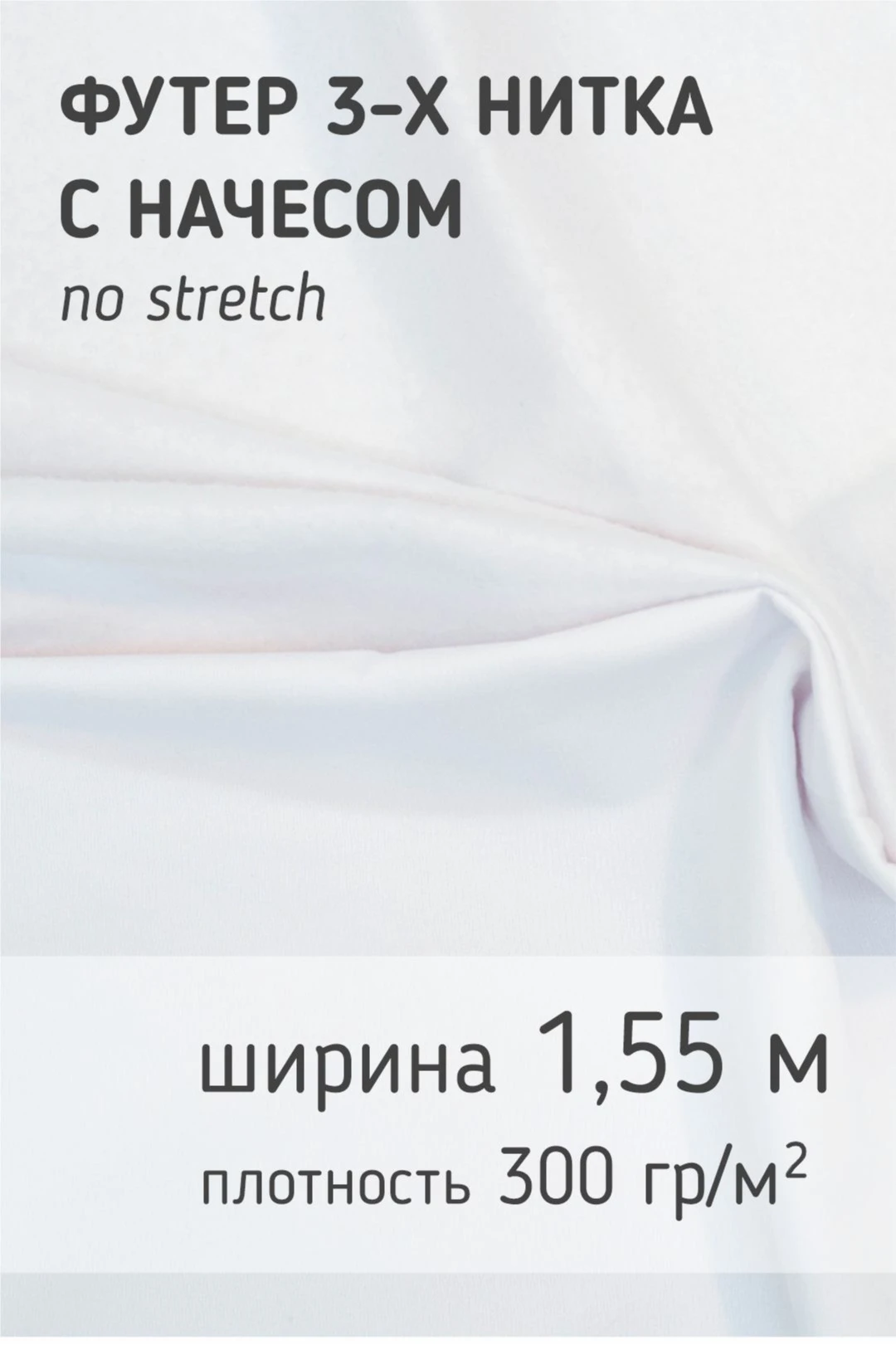 Футер 3-х нитка с начёсом обладает внешней гладкой поверхностью и тёплым начёсом с изнанки. Материал очень тёплый, подходит даже для сильных холодов; приятный и уютный к телу. Из Футера 3-х нитки шьют утепленную повседневную одежду, спортивные костюмы, удобную одежду и аксессуары для дома. Материал подходит для сублимационной печати.