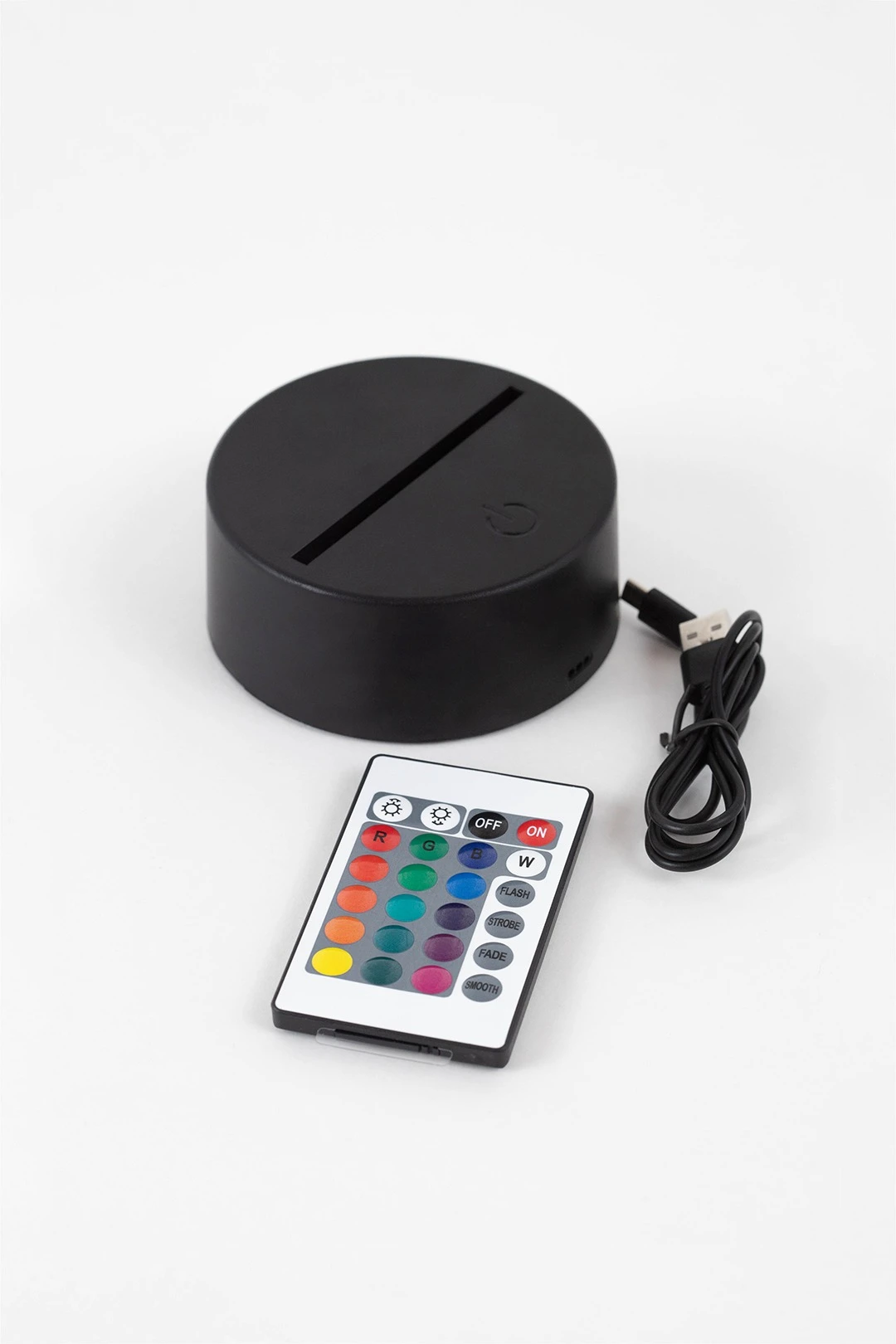Основание с подсветкой для изготовления 3Д светильника 16 цветов подсветки. В комплект поставки входит USB кабель и пульт для удаленного управления. Основание работает от 3-х батареек ААА или от USB провода. Светящаяся часть для основания изготавливается из листового акрила толщиной 4 мм (не входит в комплектацию основания). Длина вставки из акрила 7 см.