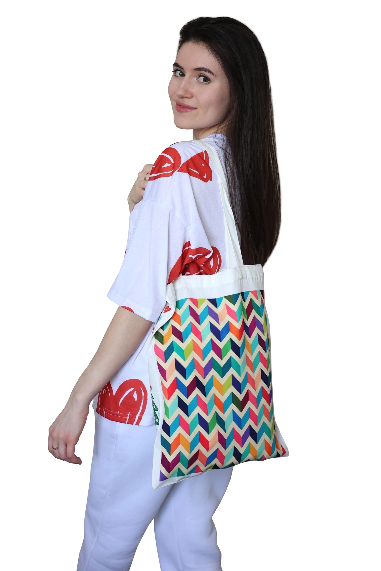 Сумка Румми пошита в стандартной прямоугольной форме. Модель выпускается с длинными ручками, позволяющими с удобством носить ее на плече. На одну сторону сумки мы можем добавить любое нужное вам полноцветное изображение.