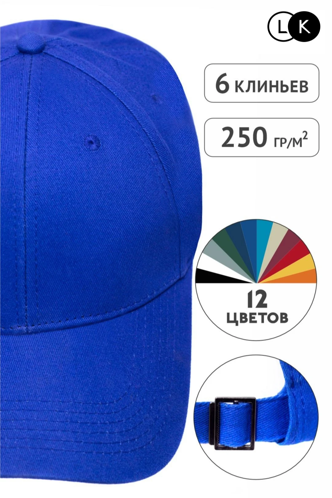 Модель. Купол бейсболки состоит из шести клиньев. Металлическая рамка для регулирования размера.