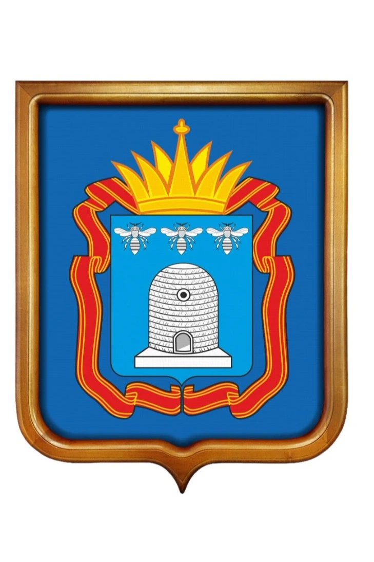 Герб Тамбовской области представлен в виде геральдического щита с фоном небесного цвета, вокруг которого вьется алая с золотом лента. Венчает его золоченая корона с семью зубцами. Вдоль верхнего внутреннего края щита изображены три серебристые пчелы, символизирующие трудолюбие. Под ними находится улей того же цвета, как символ большого общего дома.