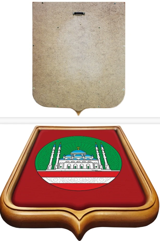 Печать: Полноцветное изображение герба наносится на ткань, которая натягивается на деревянный щит с мягкой подложкой и заправляется в деревянную раму.