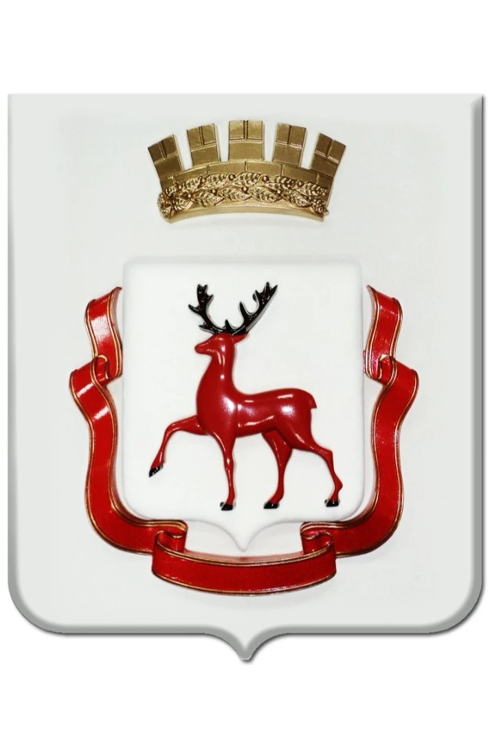 Герб города Нижнего Новгорода видоизменялся несколько раз. Свой современный облик он приобрел в 2006 году. Герб состоит из трех элементов. По центру располагается белоснежный геральдический щит с черной окантовкой. На нем изображен красного цвета олень с черными рогами и поднятой передней ногой. Над щитом - золотая пятиконечная корона с лавровым венком. Под ним и по бокам проходит красная с золотой окантовкой лента.