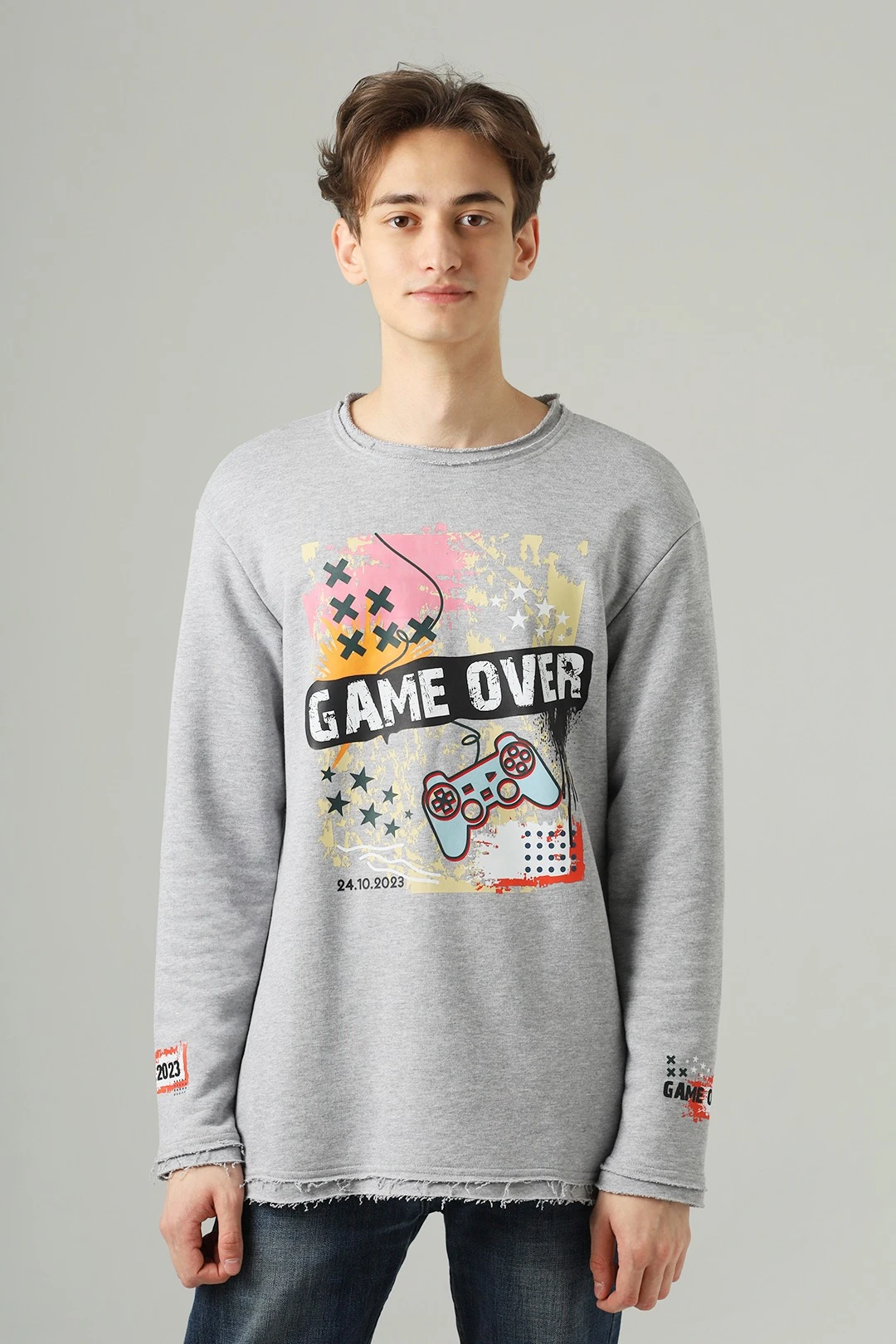 Модель. Толстовка прямого силуэта, без молнии с длинными рукавами и опущенной линией плеч. Низ толстовки и рукавов, а также горловина с имитацией необработанного края. Толстовка без капюшона и карманов.