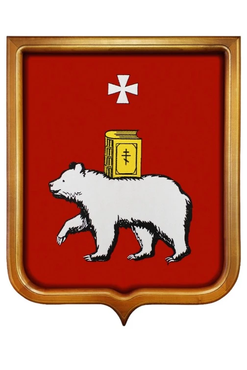 Современный герб города Перми выглядит следующим образом. Это французский геральдический щит красного цвета. Окантовка отсутствует. В центре изображен полярный медведь с поднятой передней лапой. Он повернут к зрителю левой стороной. На спине у медведя золотая книга - Евангелие. В верхней части щита расположен белый крест с расширяющимися концами.