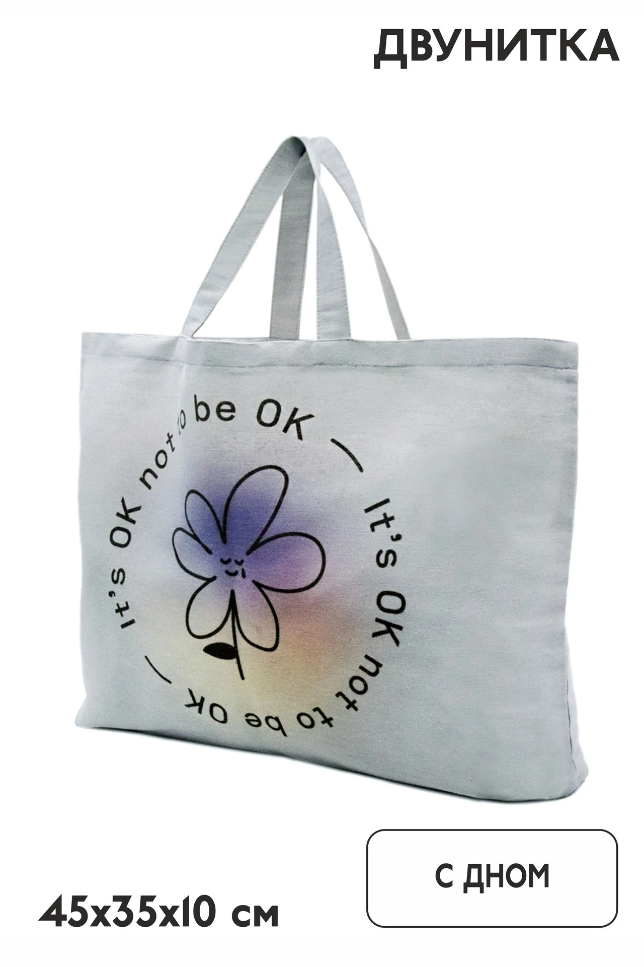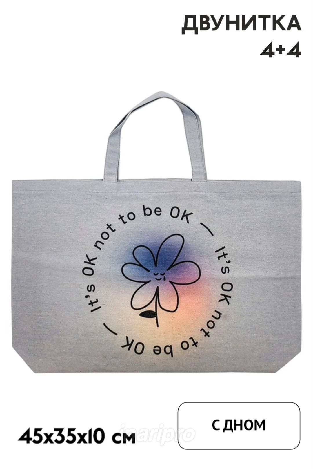 Прямая печать. Полноцветная печать осуществляется на хб материале с двух сторон и на дне сумки, ручки запечатываются фоновой заливкой без элементов дизайна. Изображение располагается в соответствии с лекалом. Нанесение входит в стоимость сумки.