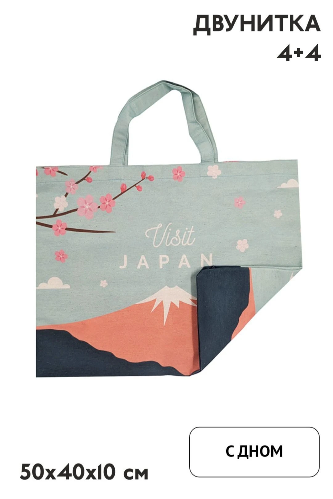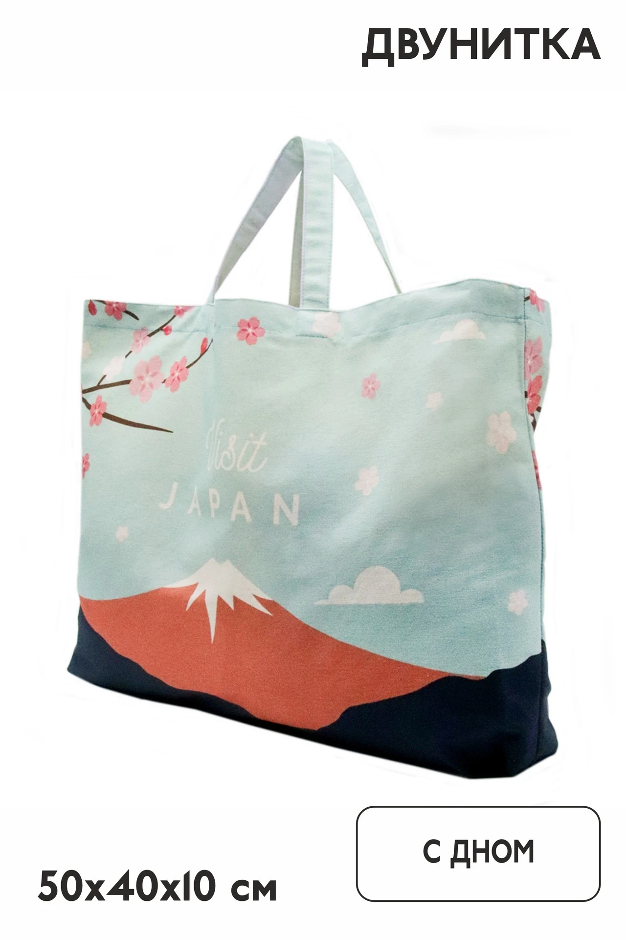 Прямая печать. Полноцветная печать осуществляется на хб материале с двух сторон и на дне сумки, ручки запечатываются фоновой заливкой без элементов дизайна. Изображение располагается в соответствии с лекалом. Нанесение входит в стоимость сумки.