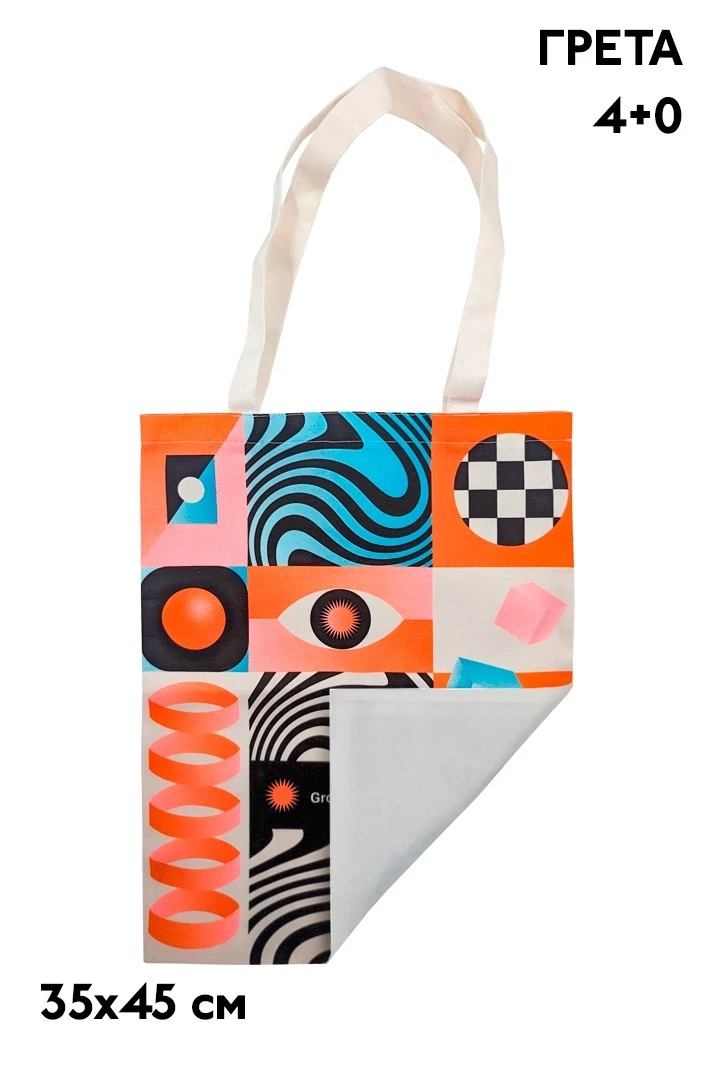 Печать с двух сторон: полноцветная печать осуществляется с двух сторон по всей поверхности сумки, ручки сумки запечатываются фоновой заливкой без элементов дизайна.
