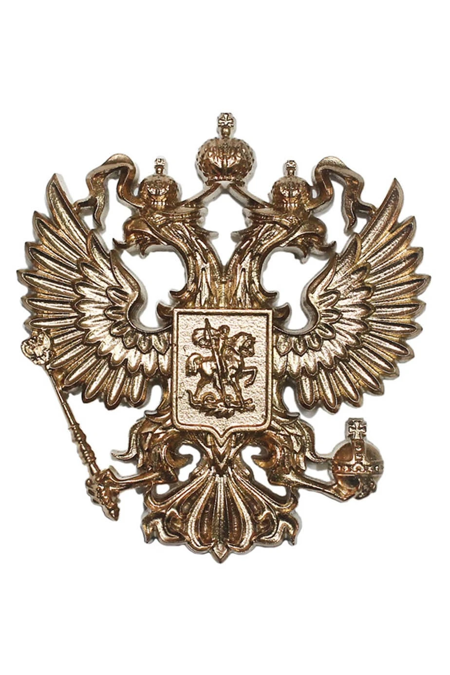 Размер, форма: 6,5х7,5 см. Орёл без геральдического щита. Все элементы герба окрашены в один цвет. Крепление на поверхность осуществляется на двухстороннюю липкую ленту.