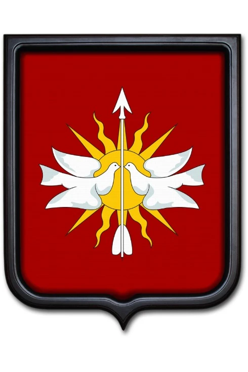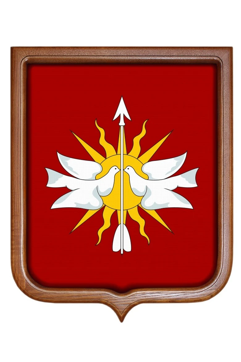 Форма, размер: Герб имеет форму французского щита размером 35х43 см. На оборотной стороне имеется крепление "крокодил" для подвешивания герба на стену.
