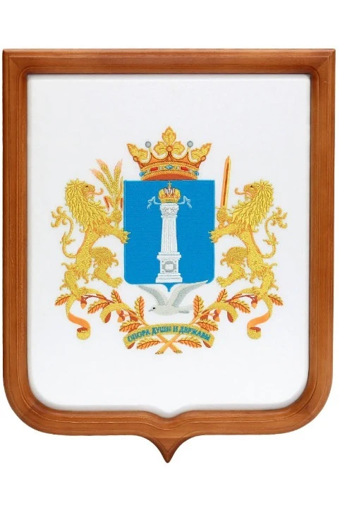 Фон: Изображение герба вышито на однотонной ткани (бархат) белого цвета, а также вышивка может быть осуществлена на другом фоне по желанию клиента, в этом случае применяется ткань сатен.