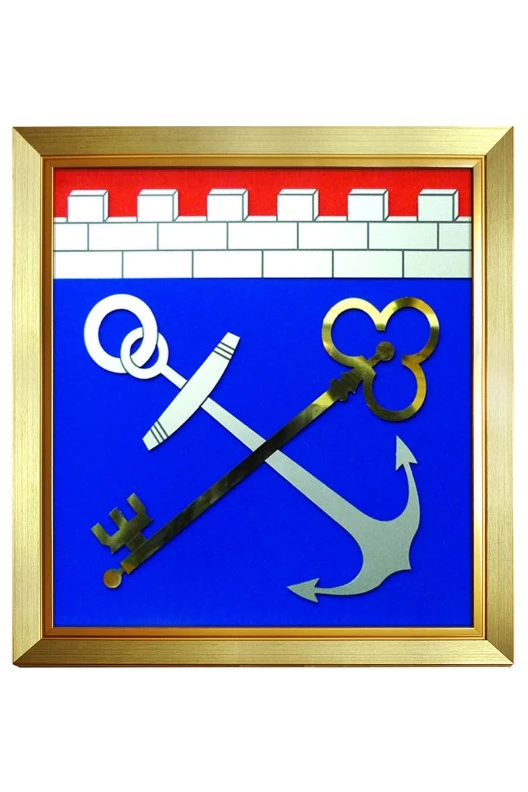 Размер, форма: 40х42 см. Гербовое панно прямоугольной формы, заключённое в рамку на выбор - красное дерево, орех, под золото. На оборотной стороне герба имеется крепление для подвешивания герба на стену.
