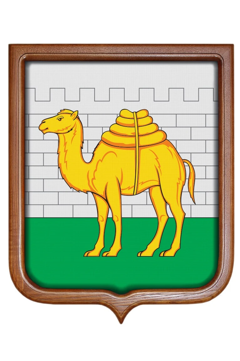 Герб Челябинска выполнен в виде французского геральдического щита с закругленными нижними углами и тонкой черной линией окантовки. Фоновый цвет - белый. Нижняя треть щита зеленого цвета. По центру изображен желтый одногорбый верблюд, навьюченный четырьмя мешками и повернутый к нам левой стороной. За ним - зубчатая белокаменная стена крепости.