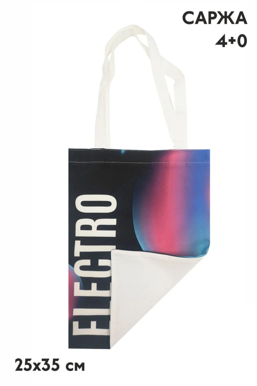 Печать с двух сторон: полноцветная печать осуществляется на хб материале с двух сторон по всей поверхности сумки, ручки сумки запечатываются фоновой заливкой без элементов дизайна.