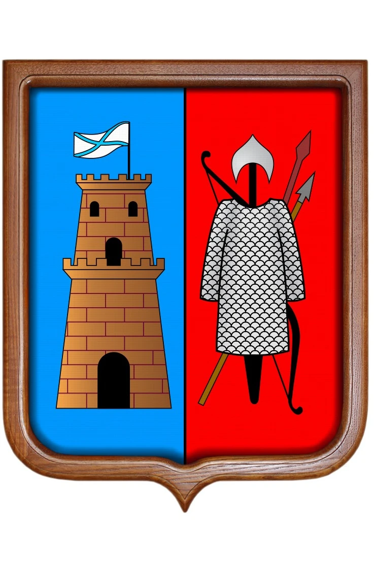 Форма, размер: Герб имеет форму французского щита размером 53х61 см. На оборотной стороне имеется крепление "крокодил" для подвешивания герба на стену.