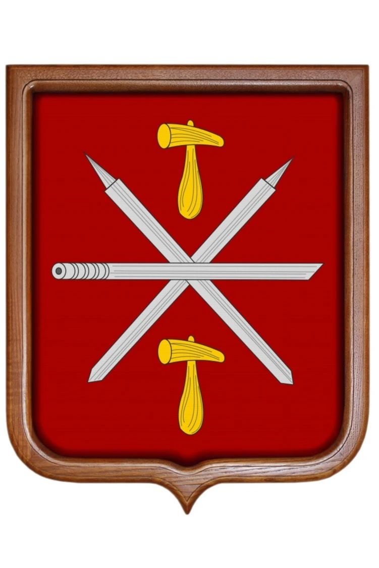 Форма, размер: Герб имеет форму французского щита размером 53х61 см. На оборотной стороне имеется крепление "крокодил" для подвешивания герба на стену.
