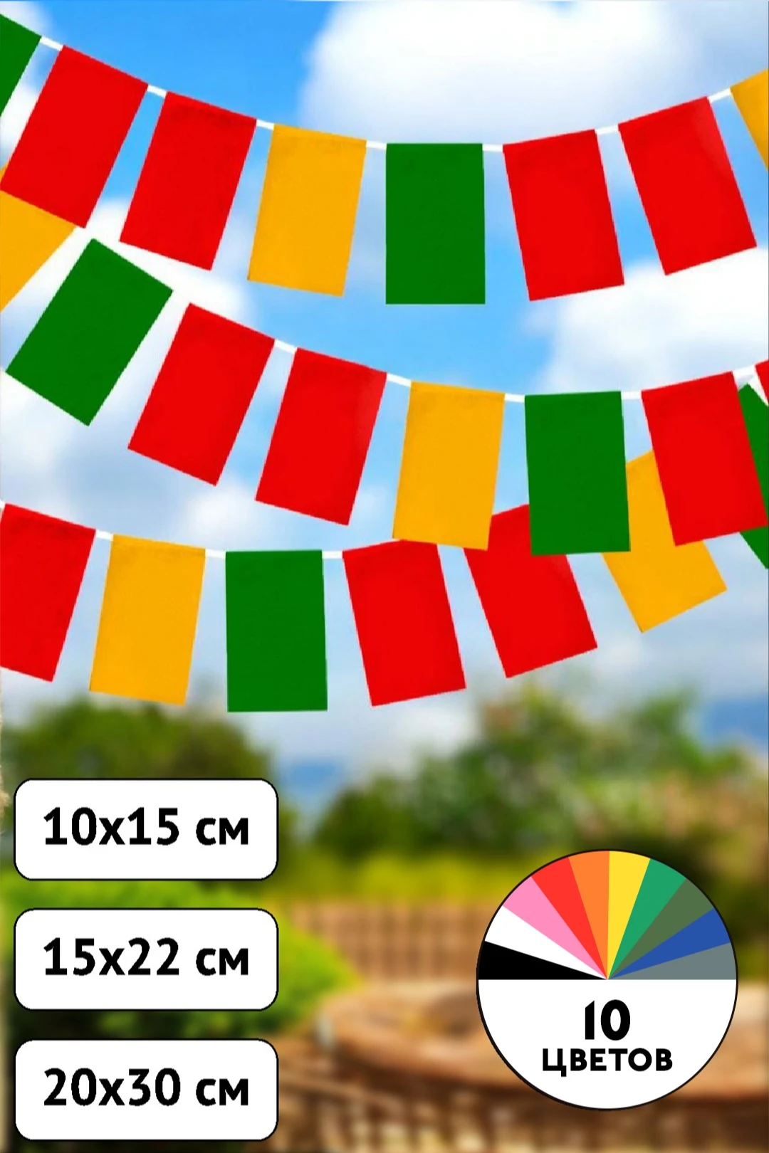 Гирлянда из флажков может быть выполнена в одном цвете или с использованием различных цветовых сочетаний. По желанию заказчика флажная лента будет украшена логотипом, рисунком, узором. Несомненно, яркий, разноцветный волчатник не оставит без внимания украшенную им территорию.