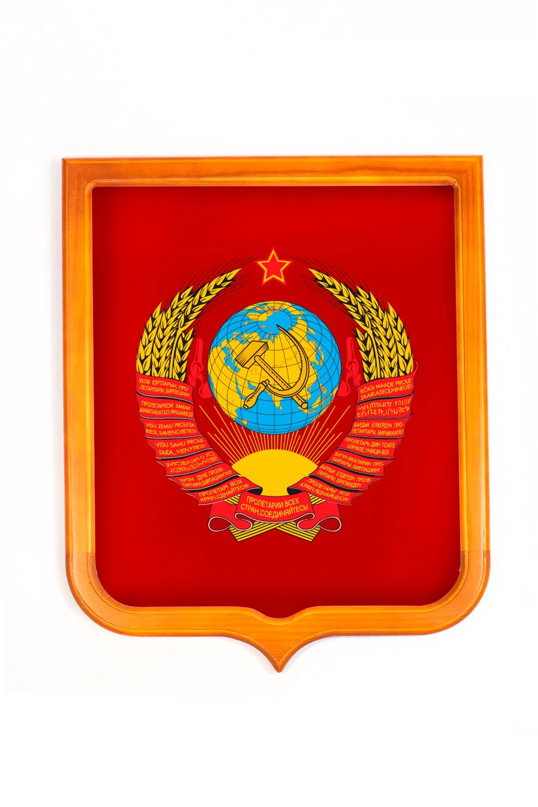 Печатный герб СССР- доступный вариант исторической символики. Изображение герба высокого качества наносится на ткань, которая заправляется в массивную деревянную раму.
