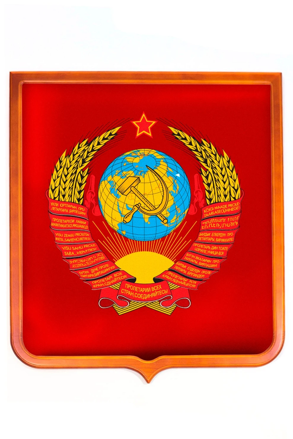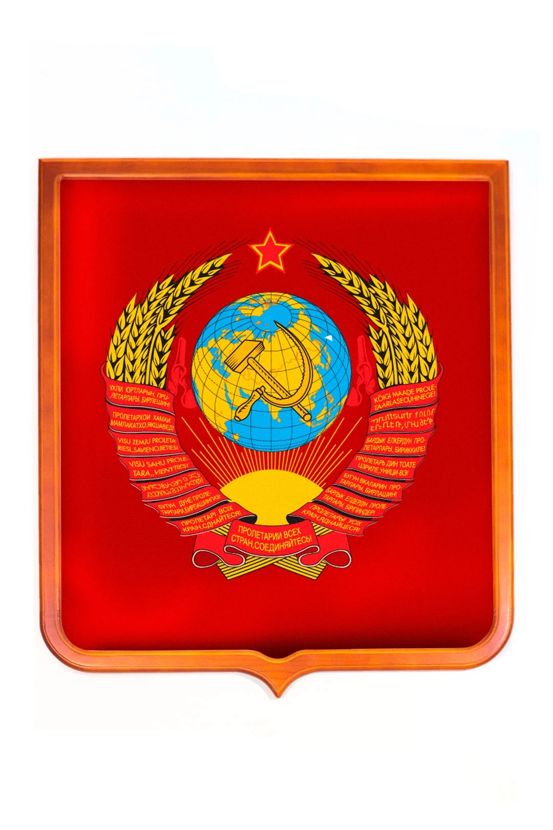 Печатный герб СССР- доступный вариант исторической символики. Изображение герба высокого качества наносится на ткань, которая заправляется в массивную деревянную раму.