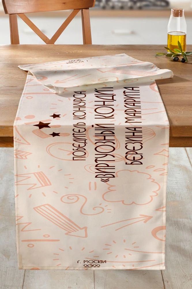 Особенности изготовления. Изображение наносится методом сублимации на всю поверхность дорожки. Изображение на скатерти размещается в соответствии с лекалом.