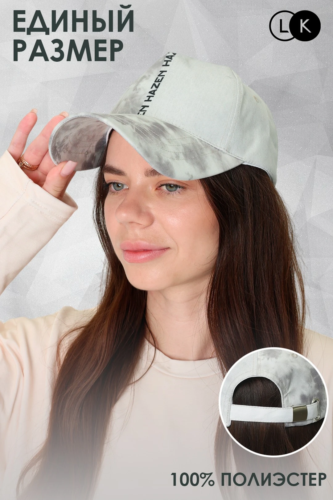 Модель. Купол бейсболки состоит из пяти клиньев с четырьмя вентилируемыми отверстиями по периметру. Металлическая застежка регулирует размер бейсболки.