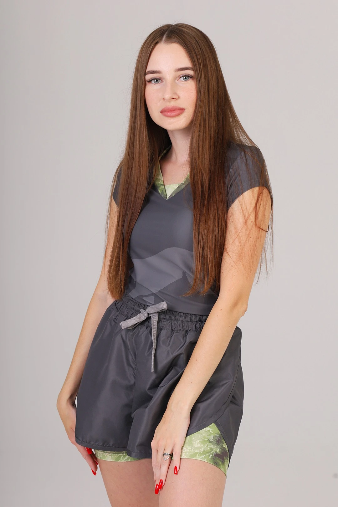 Модель: Шорты свободные двухслойные на резинке. Внутренние шорты облегающие, внешние - свободные. Дополнительно регулируются полиэфирным шнуром. Окантовка по низу и по боковым разрезам. Пояс шириной 4 см.