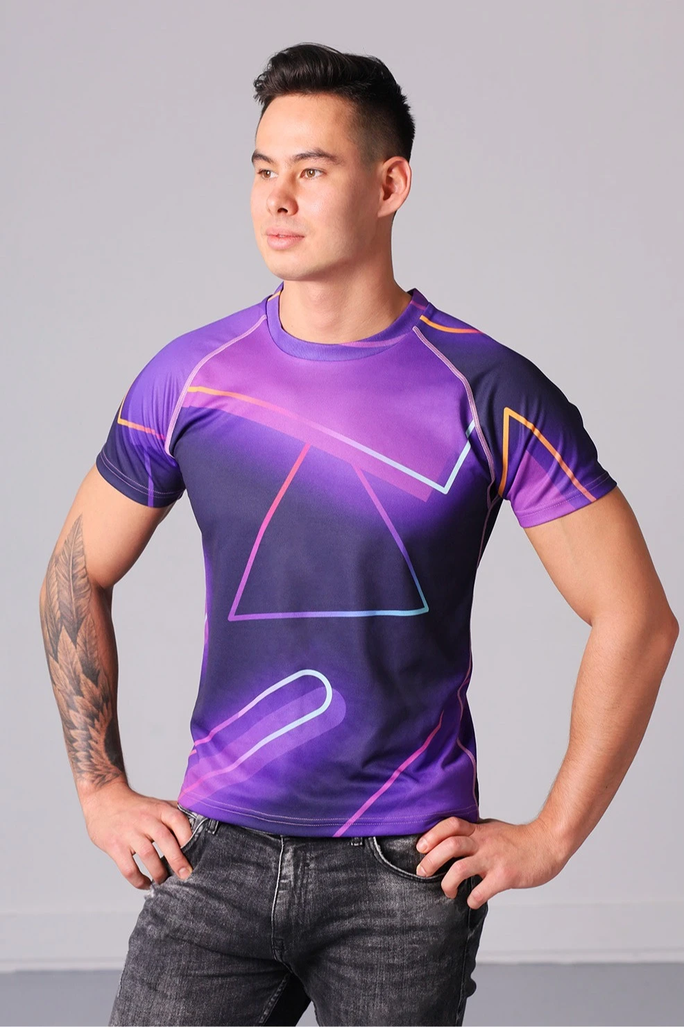 Модель. Футболка прилегающего силуэта с коротким рукавом. Форма ворота О-образная, обработка рибаной сублимационной. Рукав реглан, обработаны прошивкой швов на флетлоке.