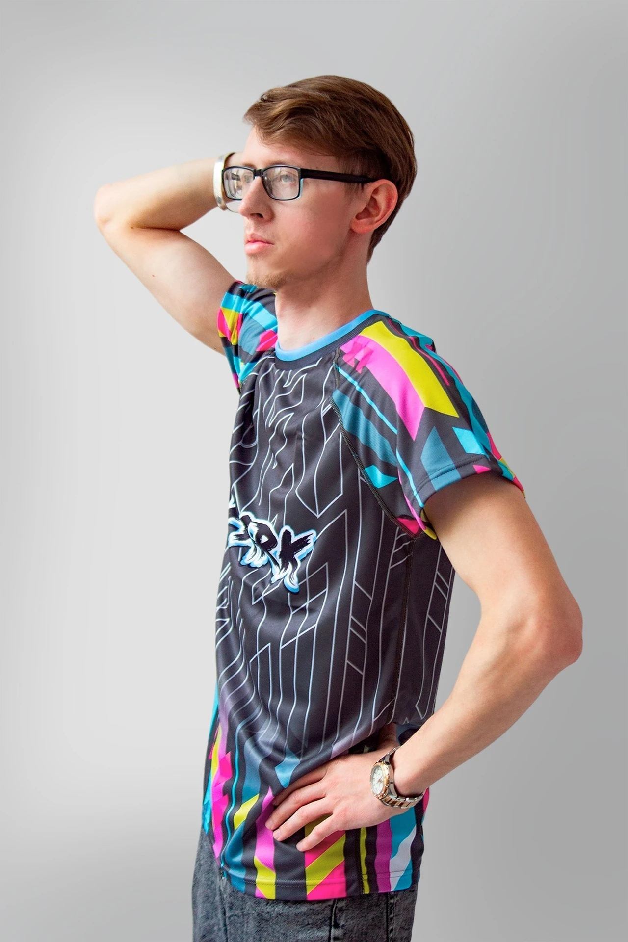 Модель. Футболка прилегающего силуэта с коротким рукавом. Форма ворота О-образная, обработка рибаной сублимационной. Рукав реглан, обработаны прошивкой швов на флетлоке.