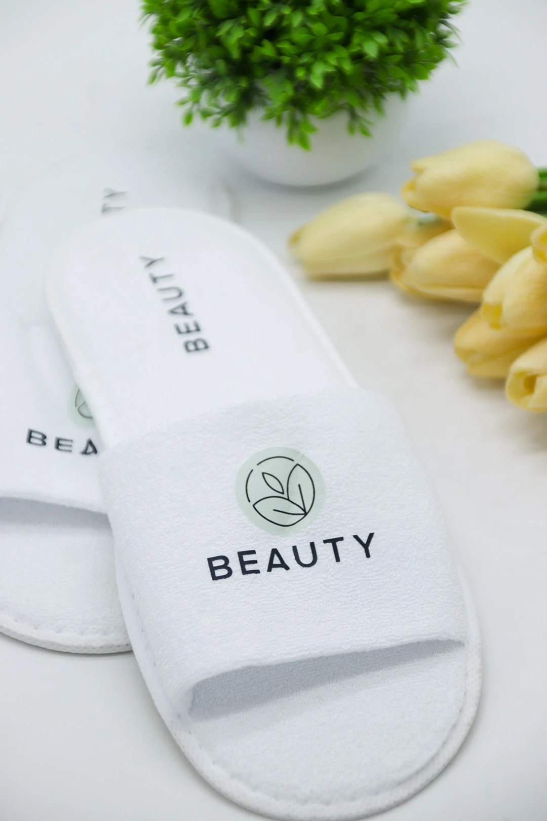 Махровые тапочки с открытым носом — удобный аксессуар и эффективный промосувенир. Яркая печать вашего логотипа или фирменного слогана на тапочках обеспечит максимальную видимость вашего бренда в повседневной жизни клиентов.
