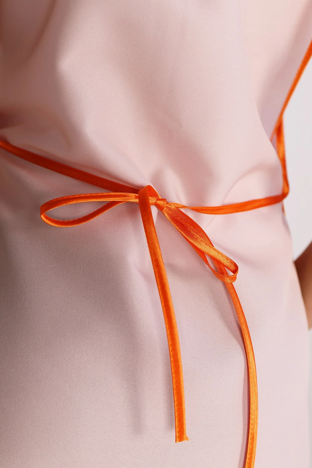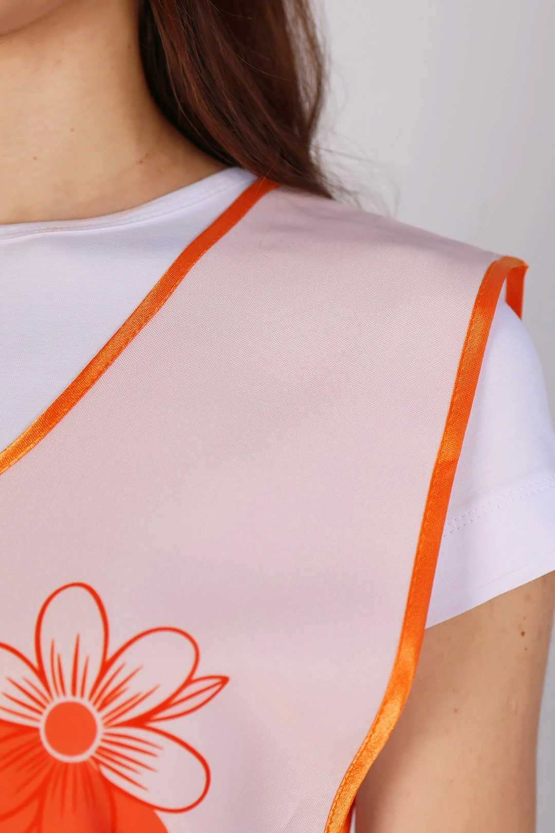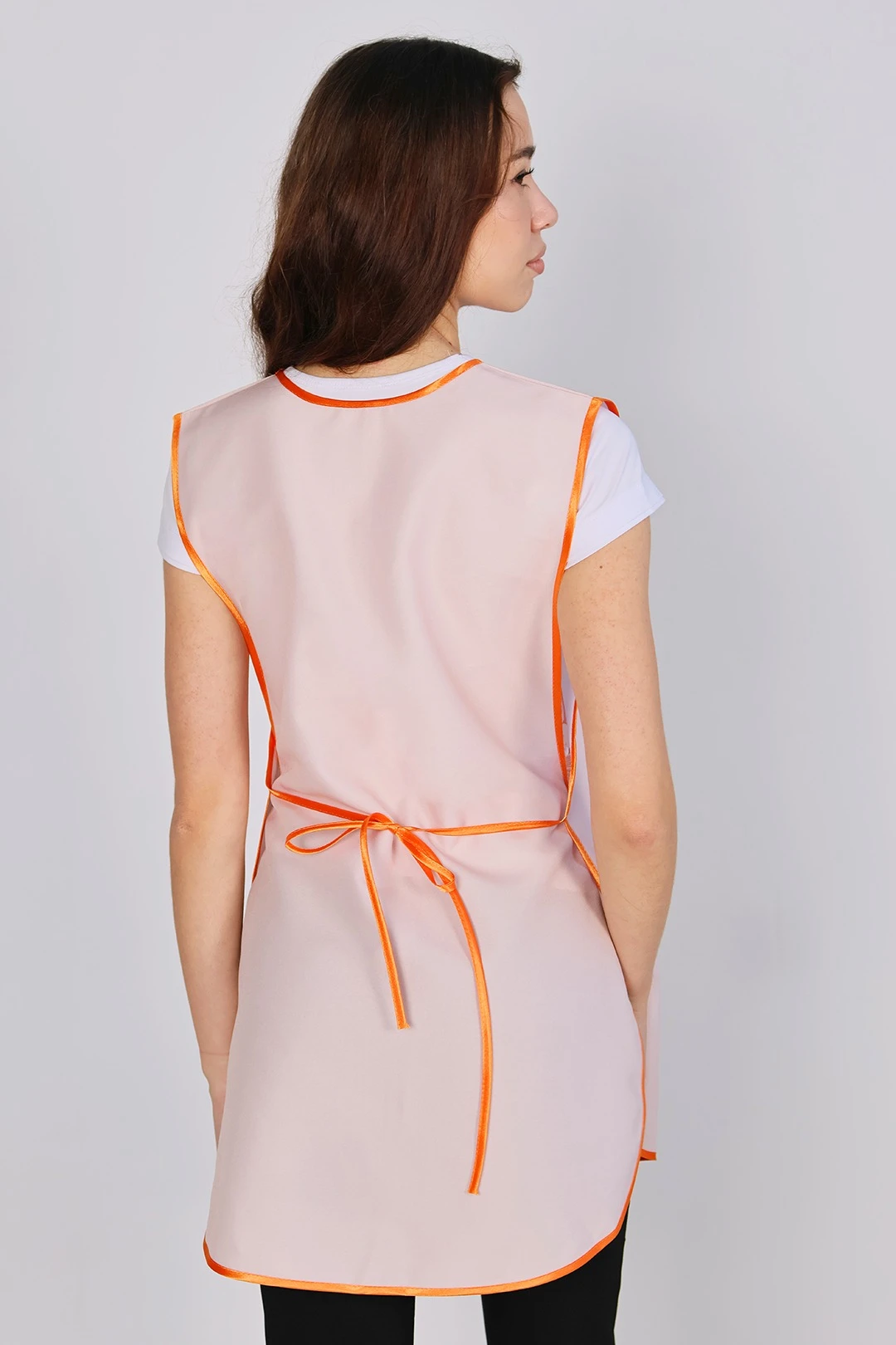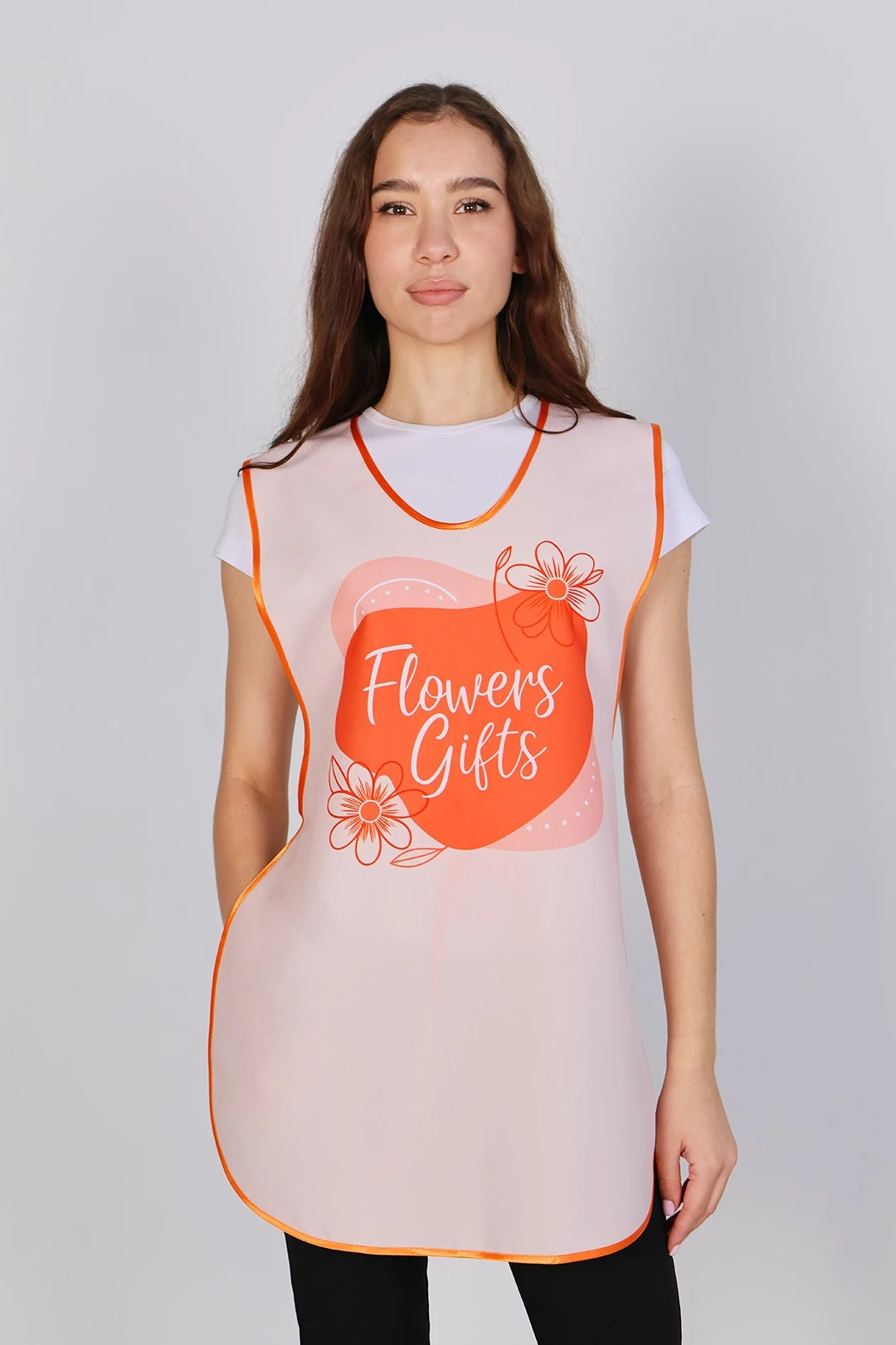 Модель: Накидка фигурной формы без карманов. За дополнительную плату фартук-накидка может быть пошит с одним карманом 20х25 см, либо двумя карманами 13х16 см. Края и горловина фартука обрабатываются косой бейкой стандартных цветов. Завязки длиной 50 см, выполнены из косой бейки.