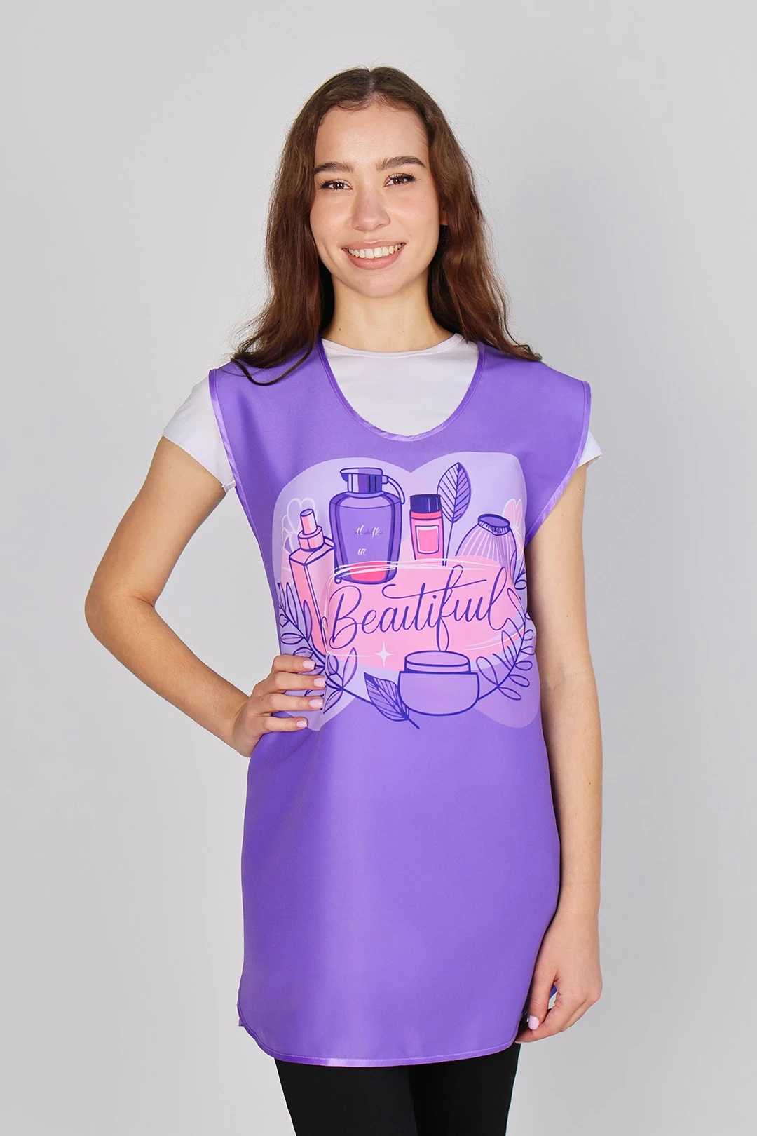 Модель: Накидка фигурной формы. За дополнительную плату фартук-накидка пошит с одним карманом 20х25 см. Края и горловина фартука обрабатываются косой бейкой стандартных цветов. Завязки длиной 50 см, выполнены из косой бейки.