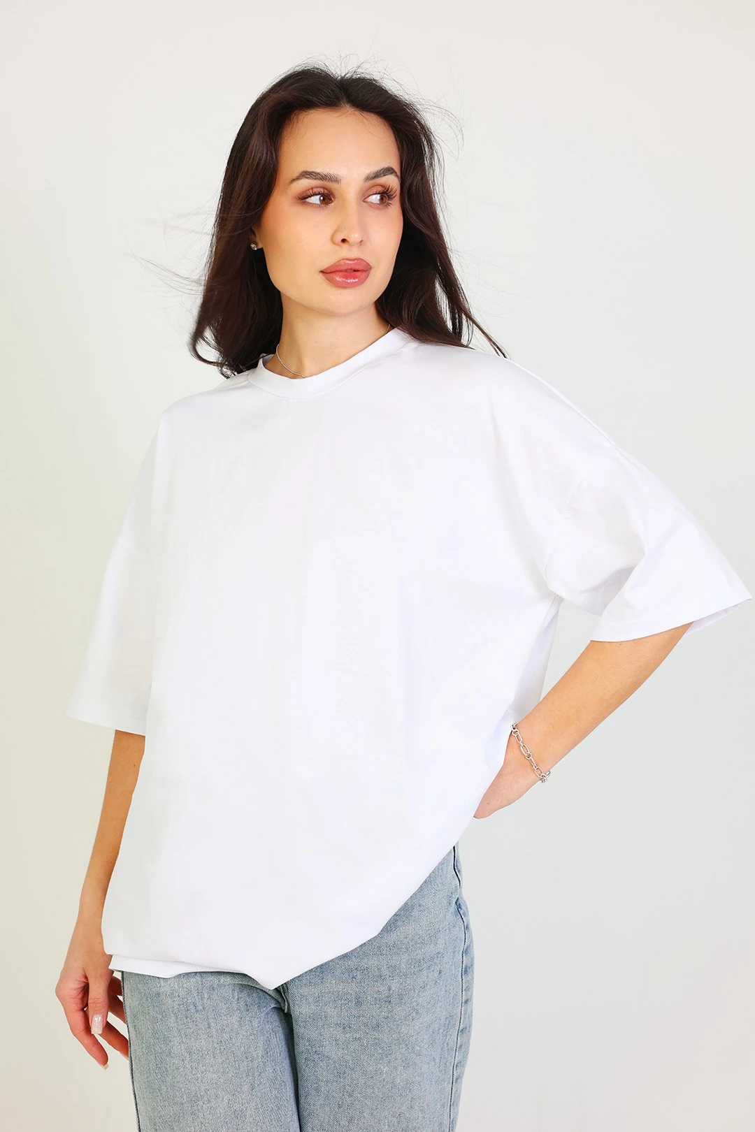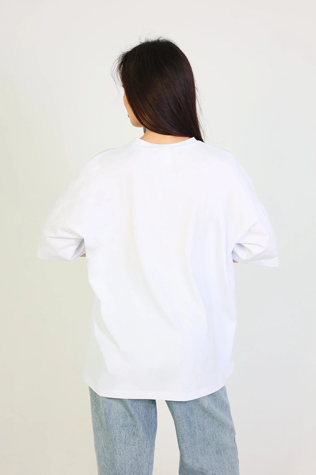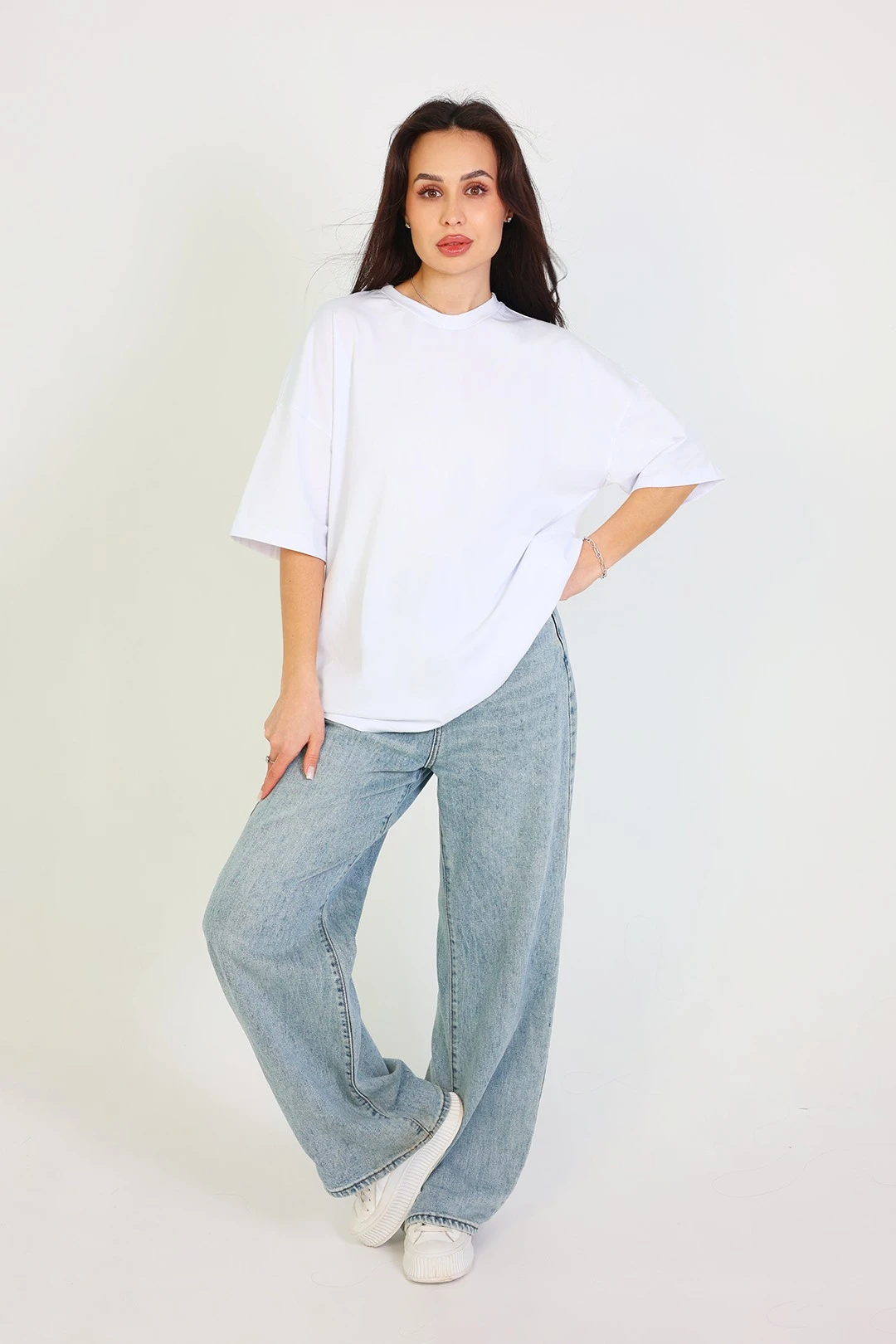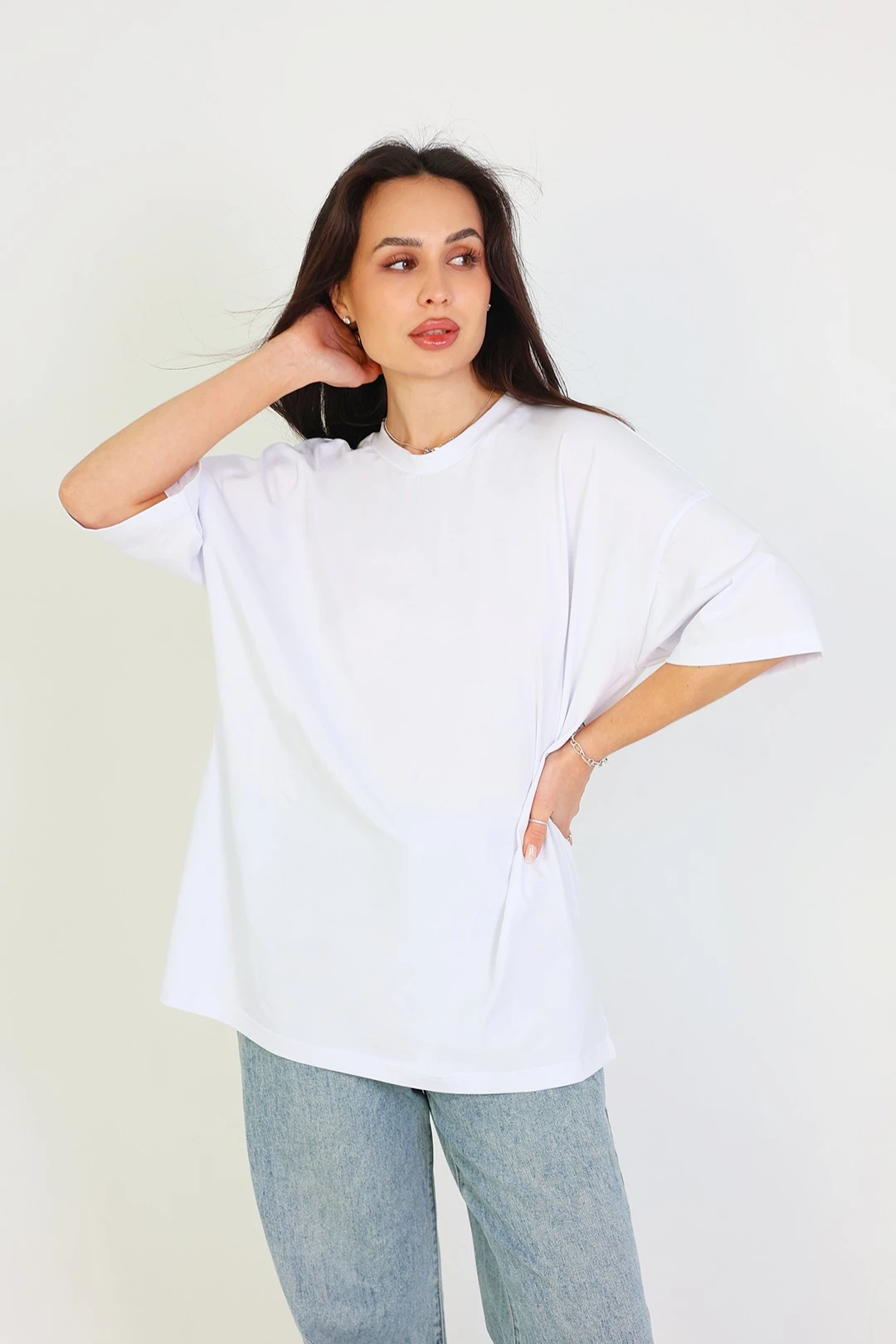 Модель. Футболка оверсайз. Обработка горловины - рибана из основной ткани. Низ изделия и рукава подгибаются внутрь. Форма ворота О-образная.