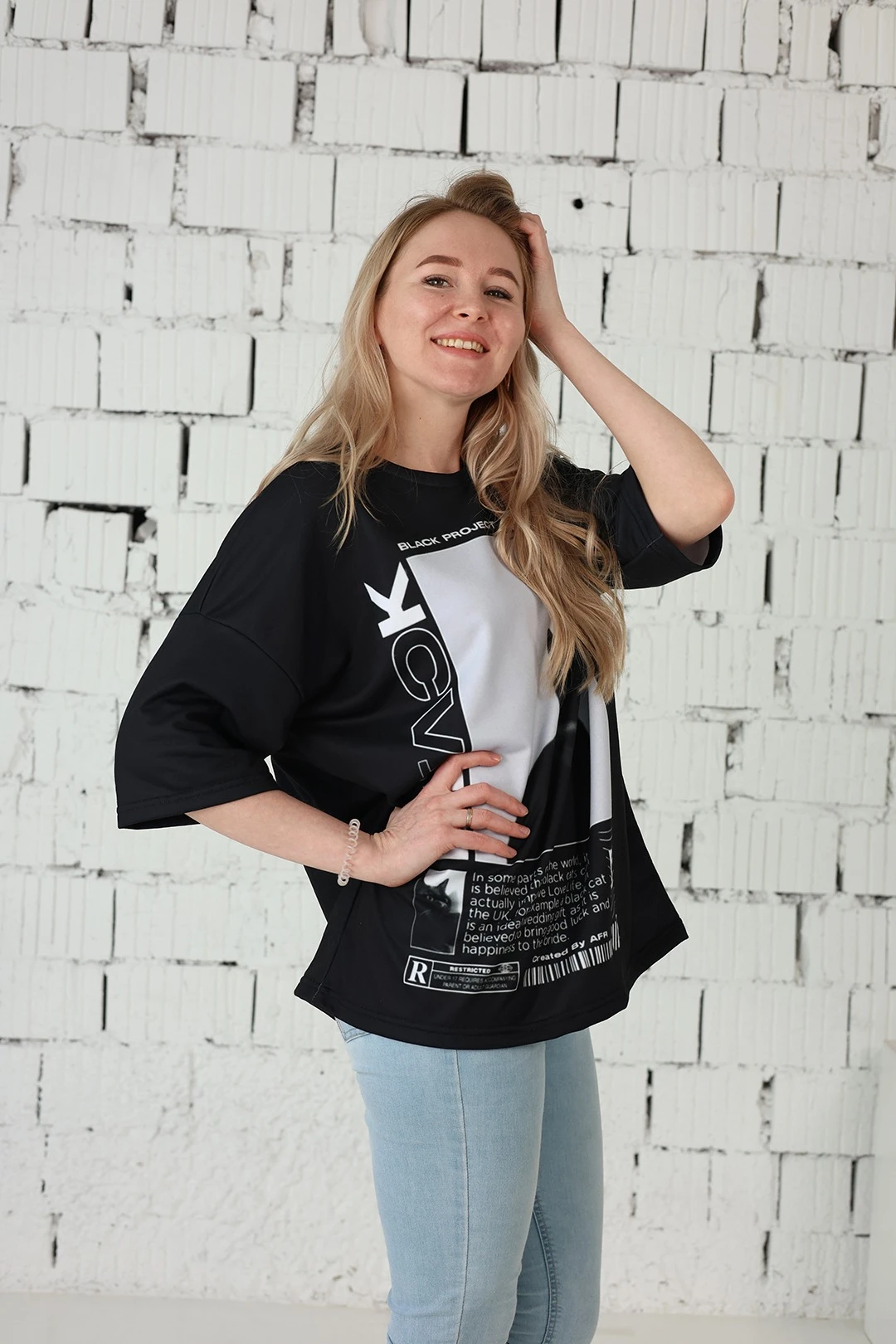 Модель. Футболка оверсайз. Обработка горловины рибана. Низ рукава и изделия подгибается внутрь. Форма ворота О-образная