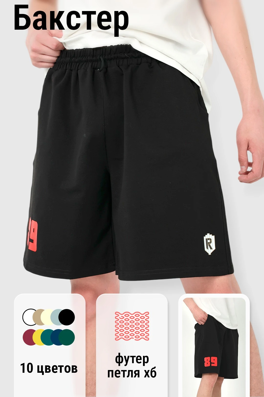 Шорты Бакстер не стесняют движений и сшиты из легкой ткани. Компания «Инари» сделает шорты оригинальной деталью одежды, нанеся на их поверхность рисунок, логотип или другое изображение по желанию заказчика.
