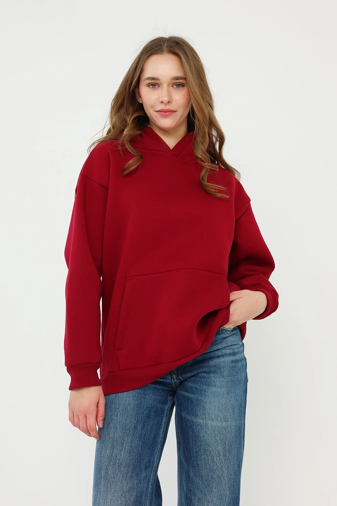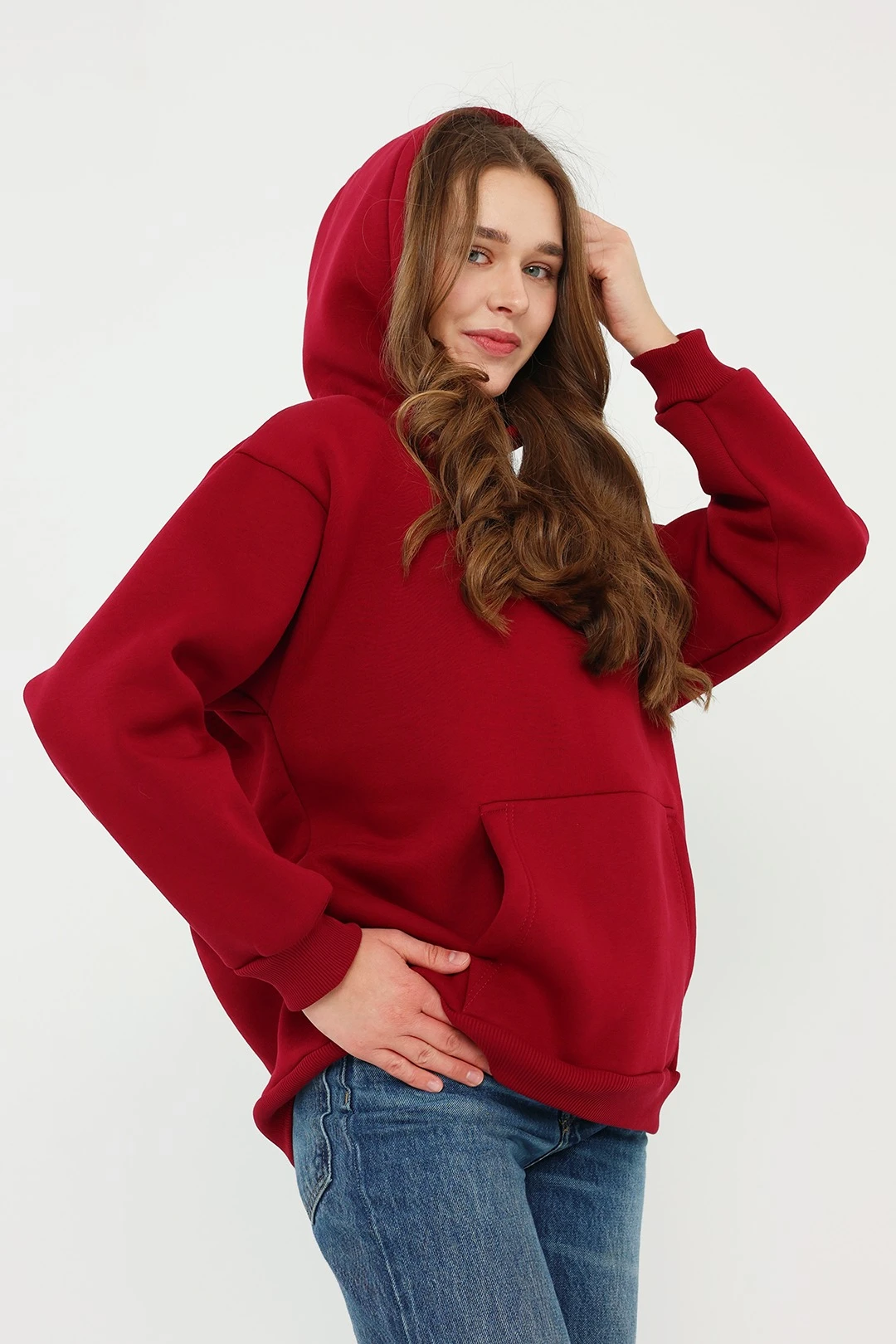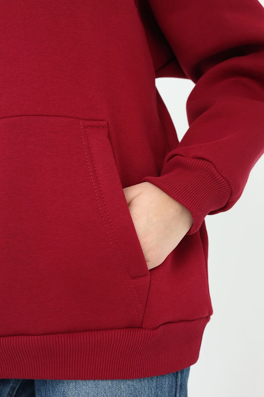 Модель. Прямой силуэт. Толстовка без молнии. Длинные рукава со спущенным плечом. Низ толстовки и рукавов обработаны тканью кашкорсе (специальная тканая резинка) в цвет толстовки. Один общий карман по типу кенгуру. Капюшон пришивной.