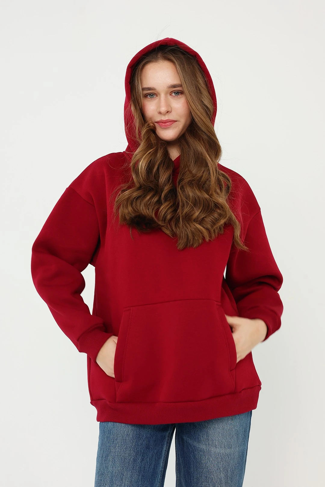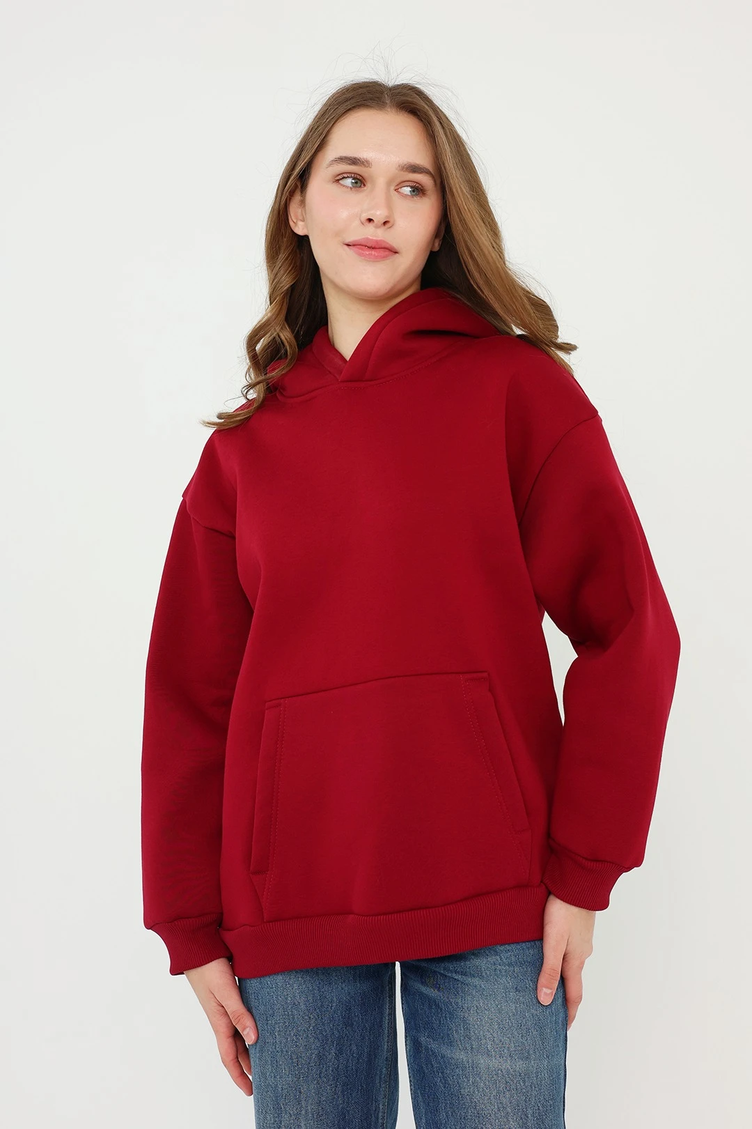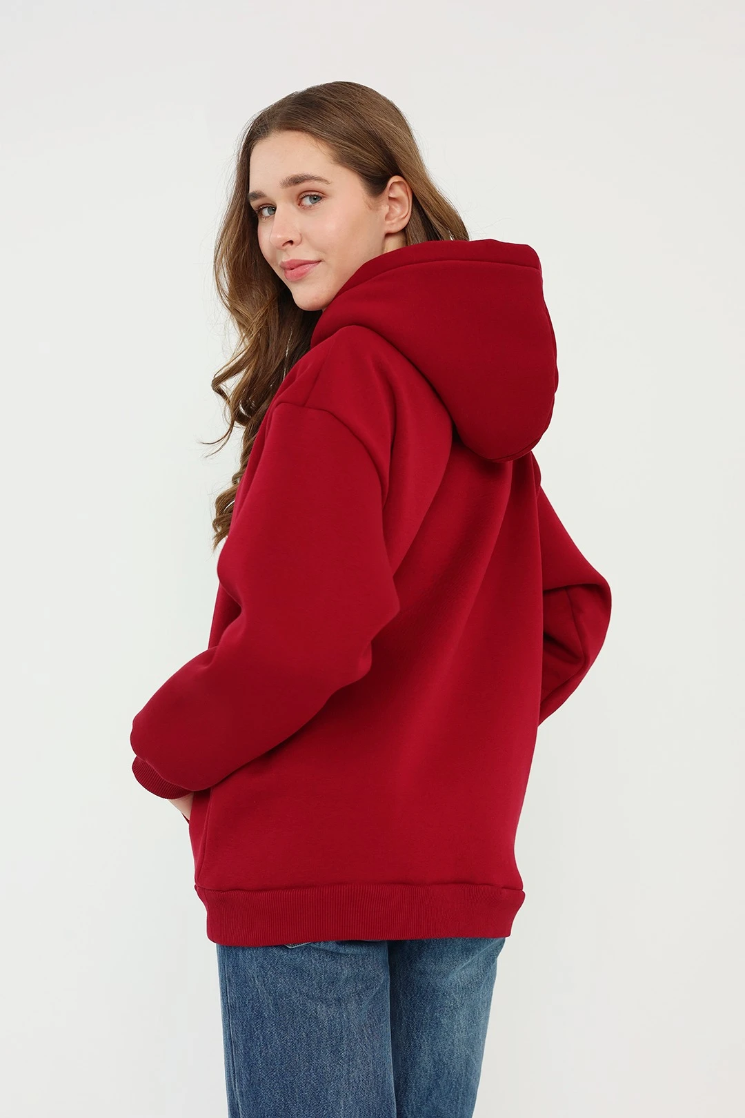 Модель. Прямой силуэт. Толстовка без молнии. Длинные рукава со спущенным плечом. Низ толстовки и рукавов обработаны тканью кашкорсе (специальная тканая резинка) в цвет толстовки. Один общий карман по типу кенгуру. Капюшон пришивной.