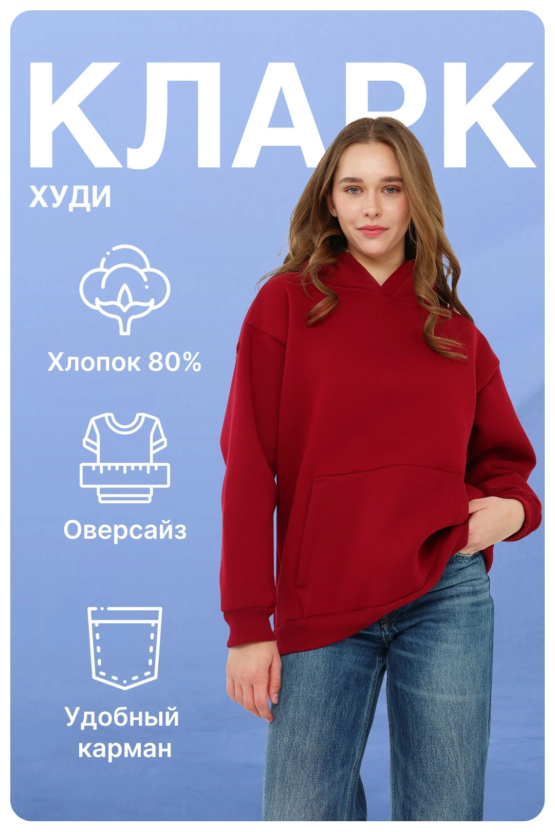 Худи Кларк с удобным капюшоном, отлично защищающий в ветреную и прохладную погоду. Худи пошита из футера – натурального хлопчатобумажного материала, лицевая сторона которого абсолютно гладкая, а внутренняя обладает мягким начесом. На внешнюю поверхность может быть нанесен нужный вам рисунок или логотип.