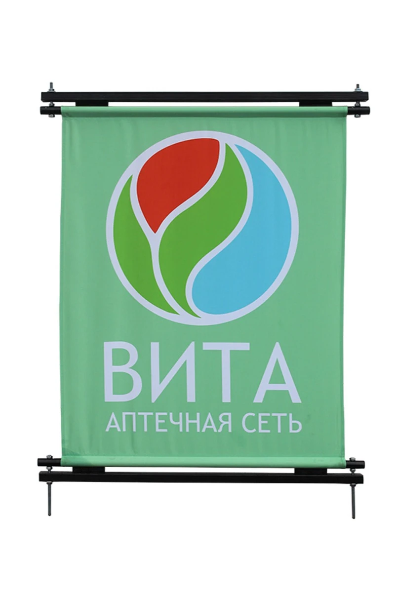 Рекомендуемые размеры флагов: высота до 200 см, ширина 50 см, 100 см или 140 см. Стандартным креплением являются сквозные карманы сверху и снизу (4,5 см в сложенном виде).