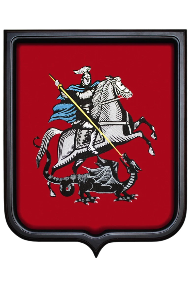 Герб Москвы с вышивкой - отличный предмет интерьера для украшения кабинета, а так же прекрасный подарок для чиновника или руководителя столичной организации.