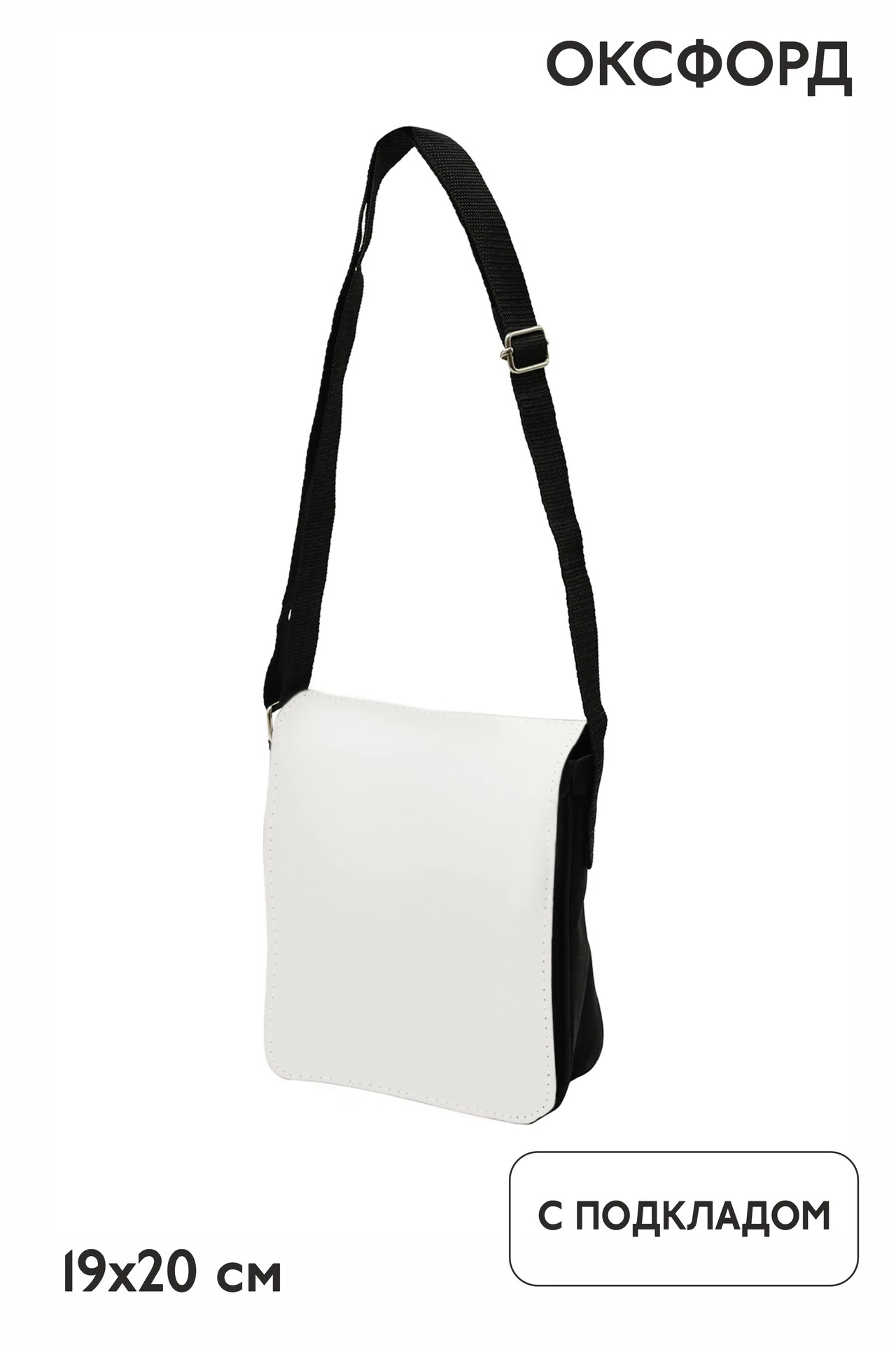 Модель: Сумка-почтальон со съемным клапаном на липучке под персонализацию методом сублимации. Сумка черного цвета, клапан - белый, под сублимацию. Ремень из стропы черного цвета.