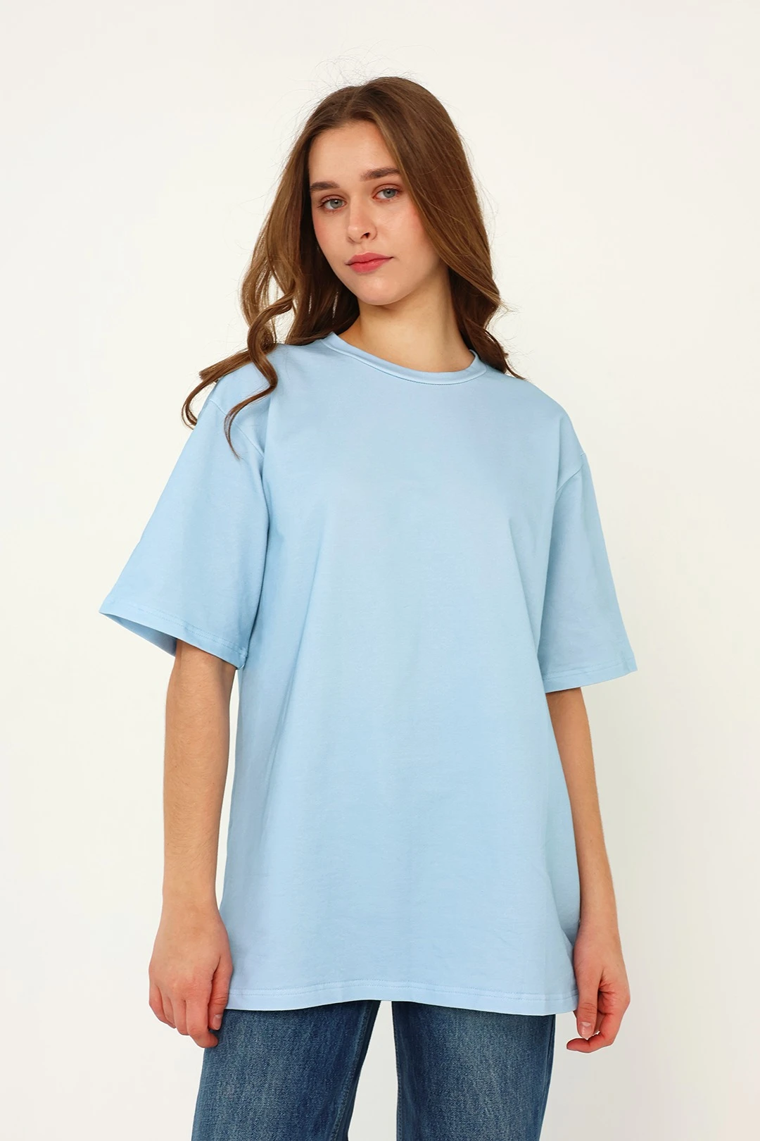 Модель. Футболка оверсайз. Обработка горловины - планка из основной ткани. Низ изделия и рукава подгибаются внутрь. Форма ворота О-образная.