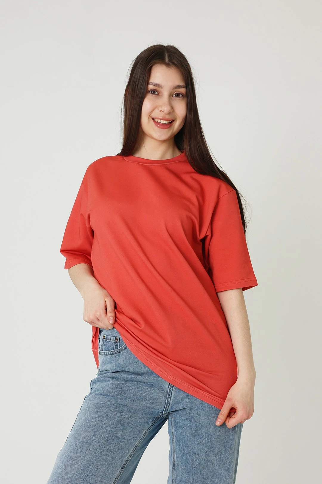 Модель. Футболка оверсайз. Обработка горловины - планка из основной ткани. Низ изделия и рукава подгибаются внутрь. Форма ворота О-образная.