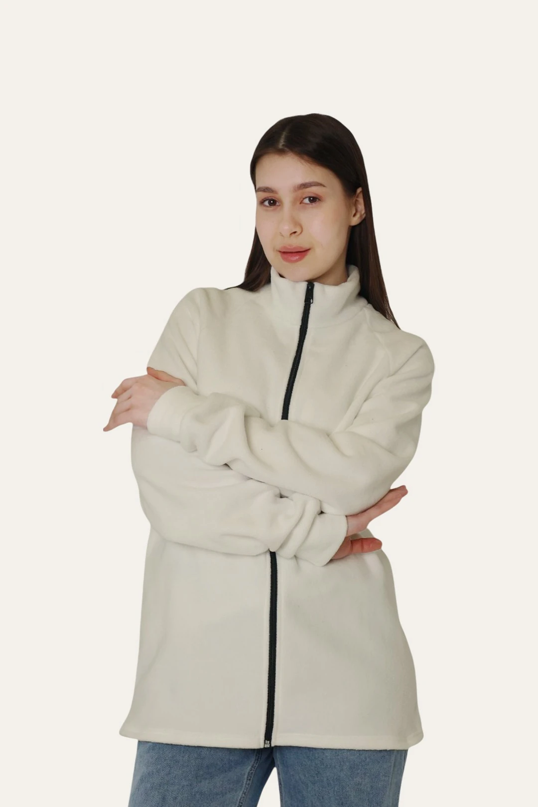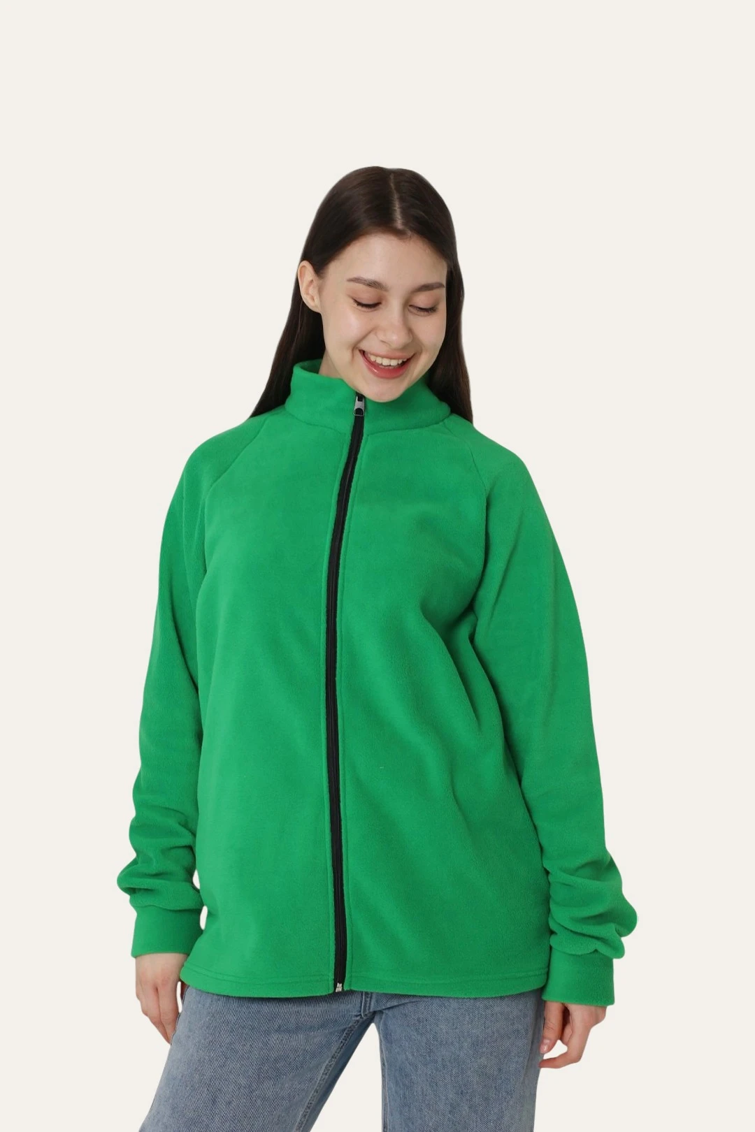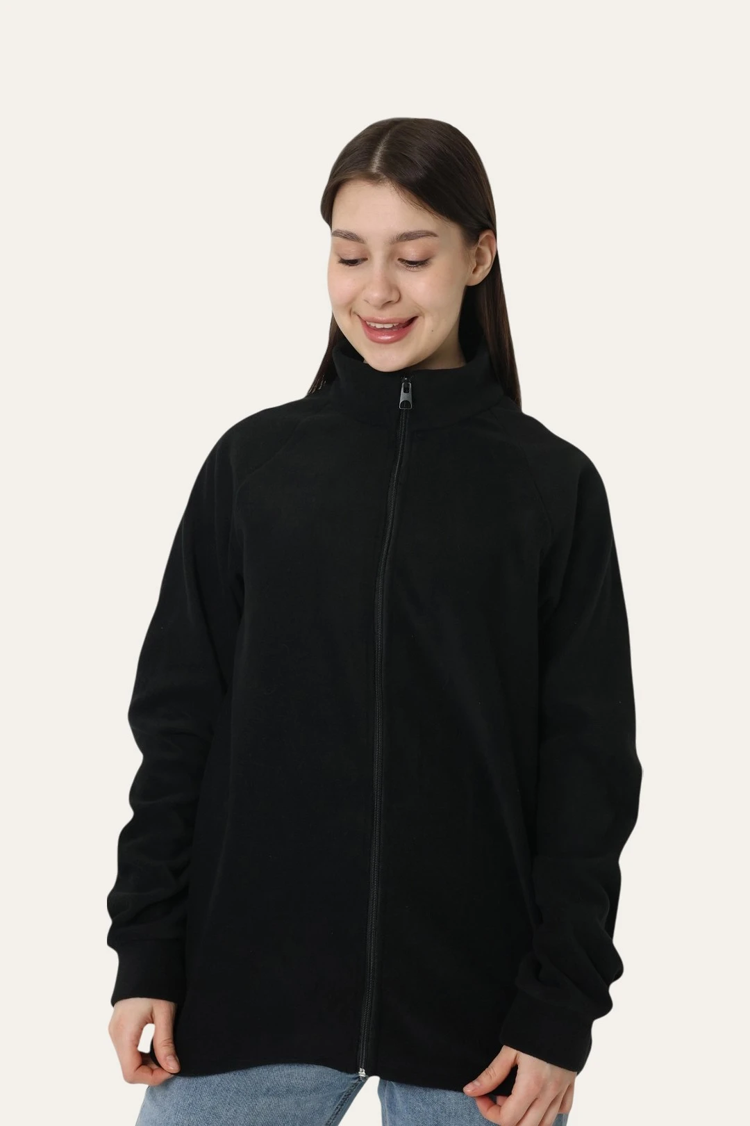 Модель. Толстовка прямого силуэта с воротником стойкой. Застегивается на молнию черного цвета. Рукав реглан с манжетой из основного материала. Толстовка без капюшона, без карманов.