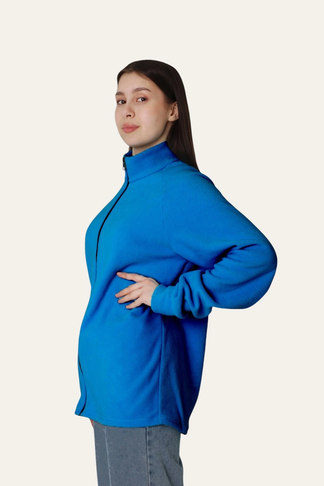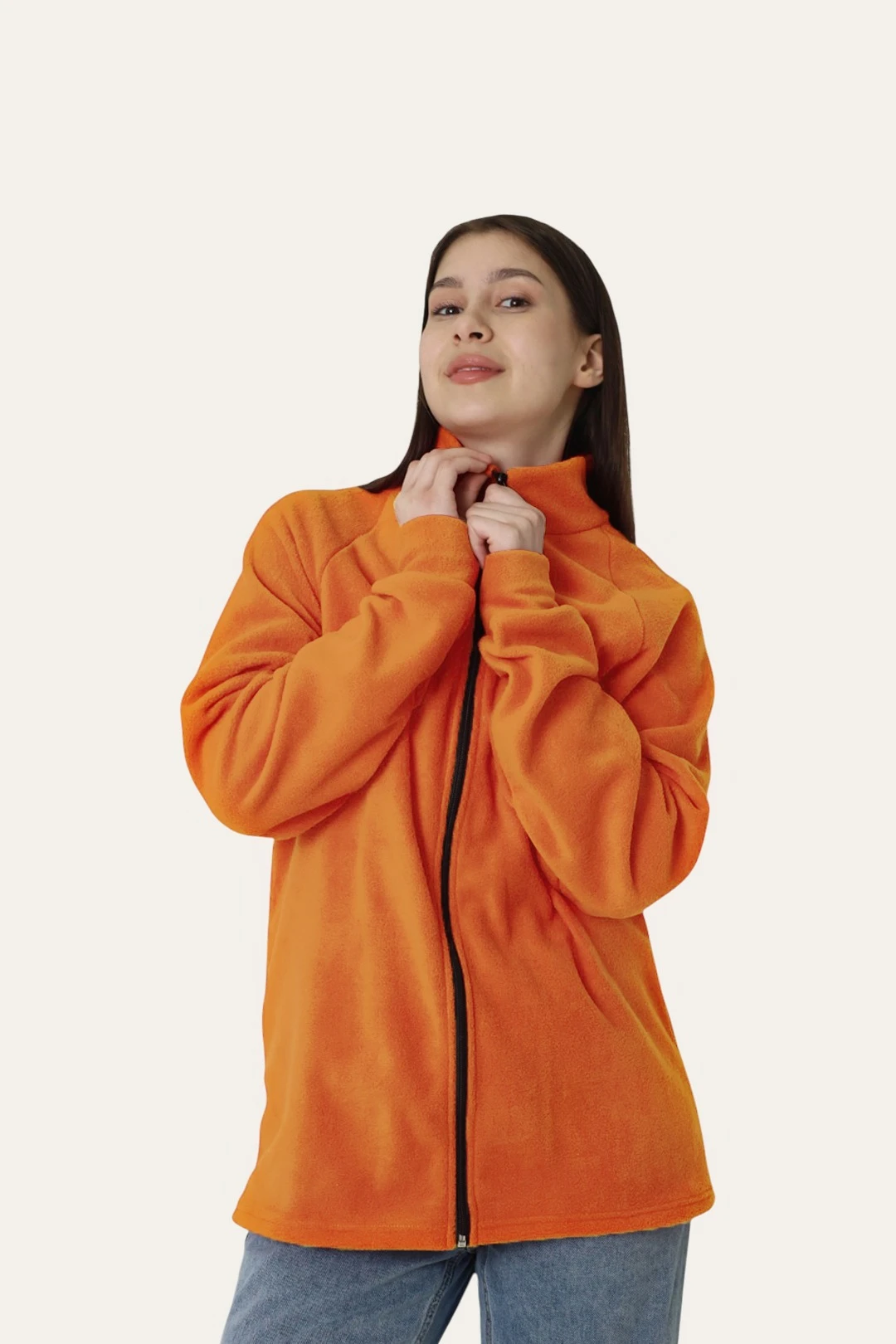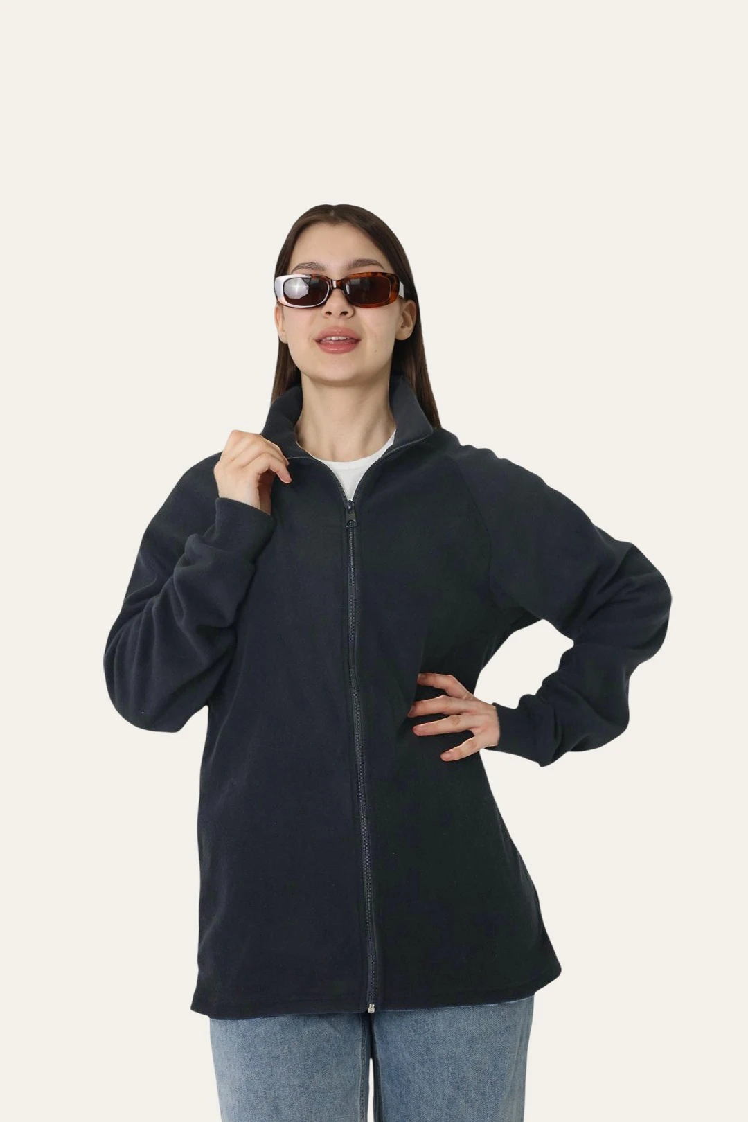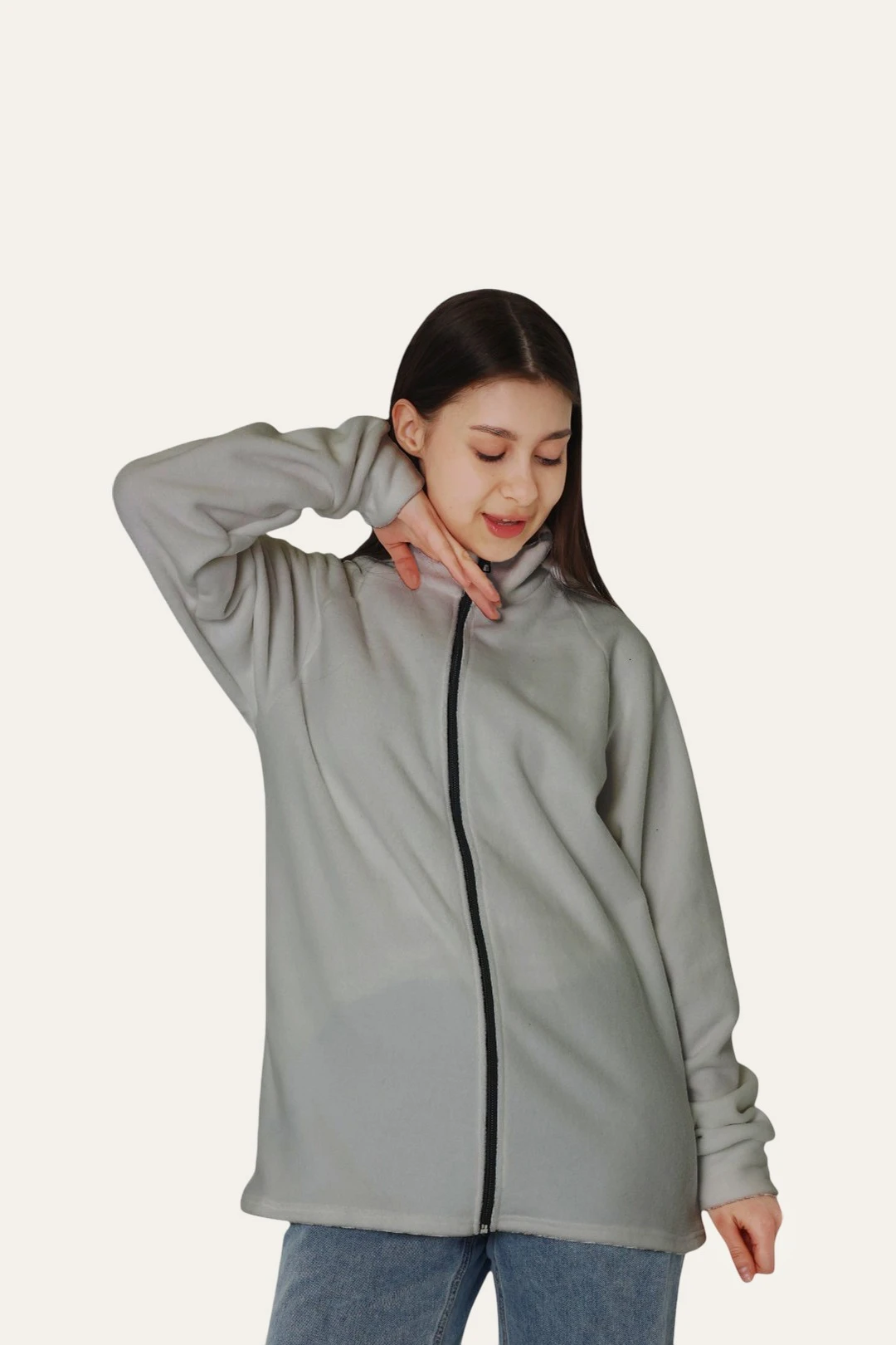 Модель. Толстовка прямого силуэта с воротником стойкой. Застегивается на молнию черного цвета. Рукав реглан с манжетой из основного материала. Толстовка без капюшона, без карманов.