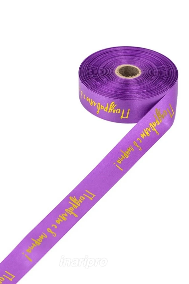 Лента сатин ширина 3 см фиолетовая, печать золотом с одной стороны