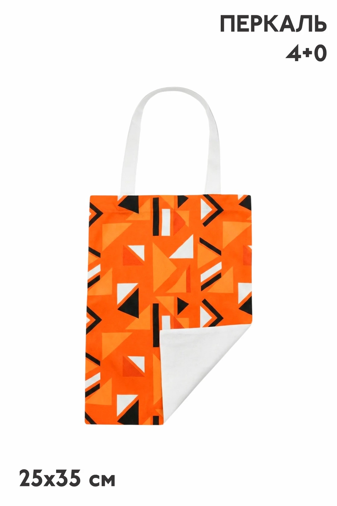 Печать с одной стороны: полноцветная печать осуществляется на хб материале на одной стороне сумки в процессе производства, ручки и вторая сторона выполнены из основного материала без печати.
