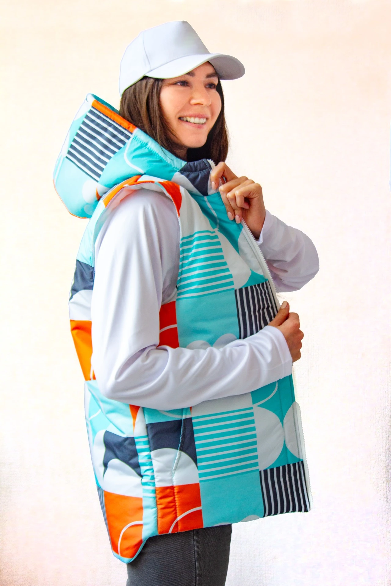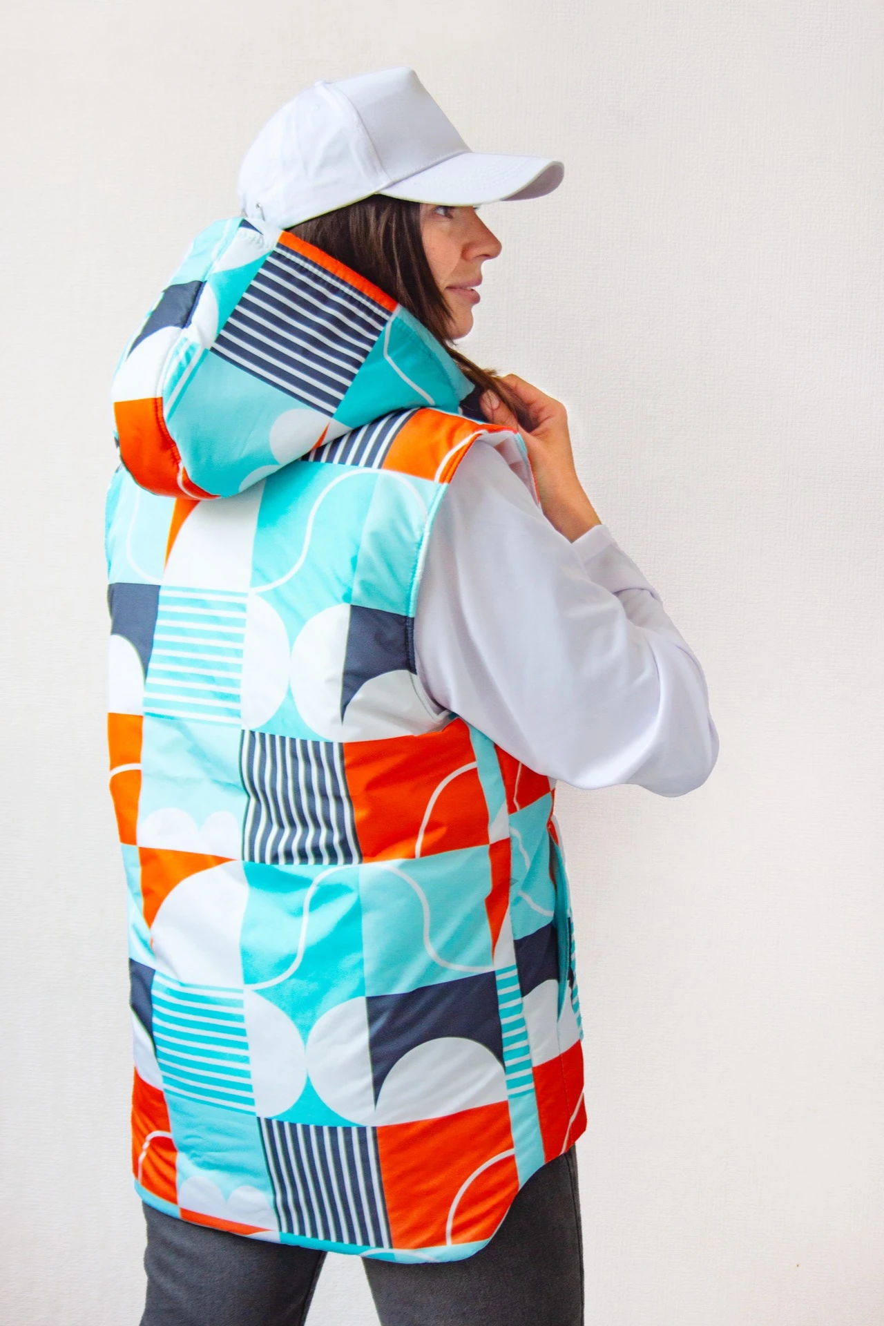 Модель: Жилет Трис прямого силуэта. Имеет два накладных кармана на утеплителе. Центральная застежка молния. Капюшон втачной. Низ изделия фигурный - удлинённая спинка.