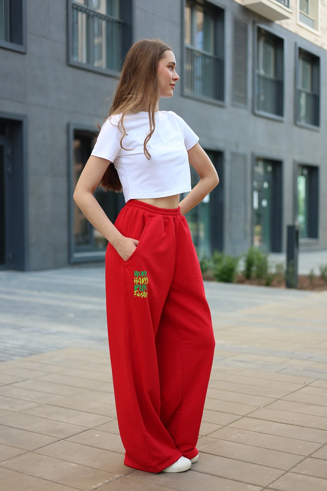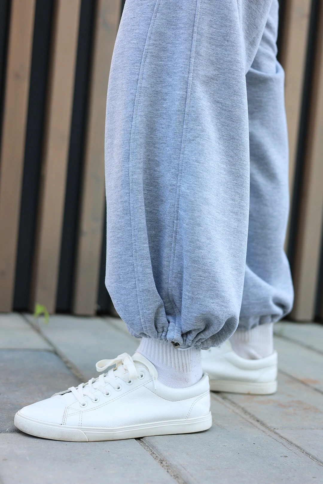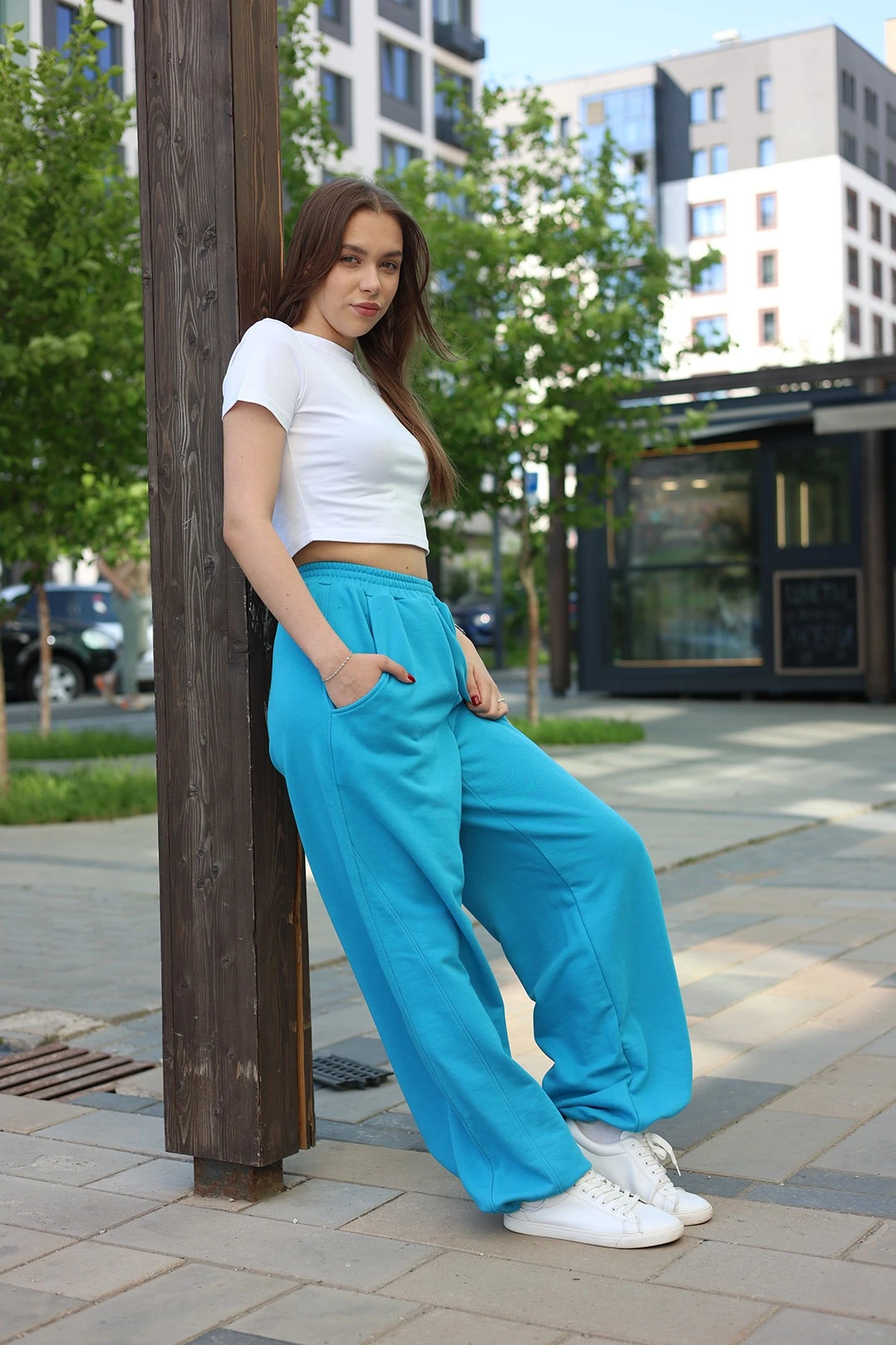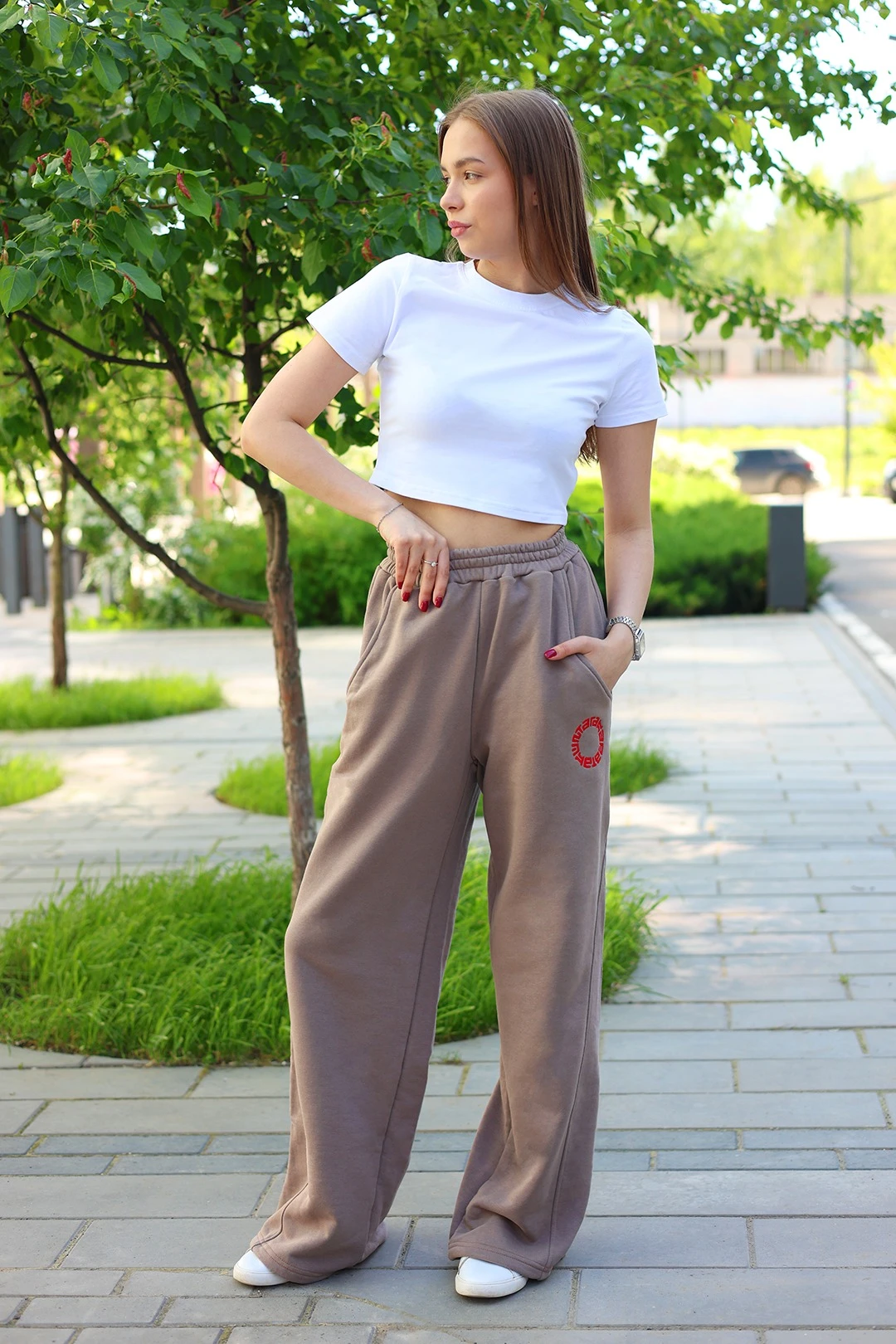 Модель: Свободные оверсайз брюки с широкими прямыми штанинами и поясом на резинке. Пояс дополнительно регулируется плетено-вязаным шнуром черного или белого цвета. Спереди брюки имеют рельефную вставку вдоль шагового шва, выполняющую декоративную функцию. Низ брюк может быть широким, а может стягиваться резинкой и фиксироваться, носиться как брюки-аладины. На брюках предусмотрены карманы без застежки.