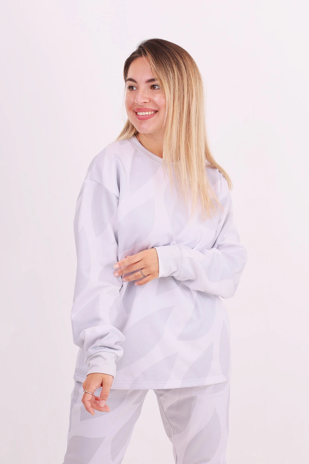 Толстовка. Толстовка прямого силуэта с длинным рукавом и спущенным плечом. Рукава с манжетой выполнены из ткани прима. Свитшот без молнии, карманов, капюшона.