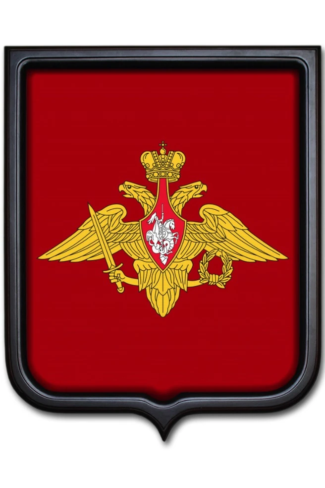 Герб Вооруженных Сил РФ - золотистого цвета двуглавый орел, изображенный с раскрытыми крыльями. В левой лапе у него находится лавровый венок, а в правой - меч. Грудь величественной птицы украшена алым 3х-угольным щитом с тонкой золотой окантовкой. На нем в серебряном цвете изображен Георгий Победоносец, поражающий дракона. Увенчан щит золотой короной с крестом.